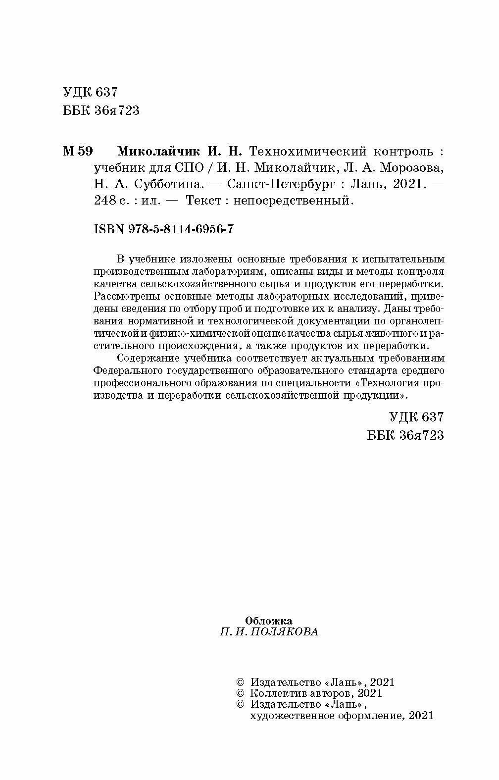 Технохимический контроль.Уч.СПО (Миколайчик Иван Николаевич, Морозова Лариса Анатольевна, Субботина Наталья Александровна); Лань, 2021