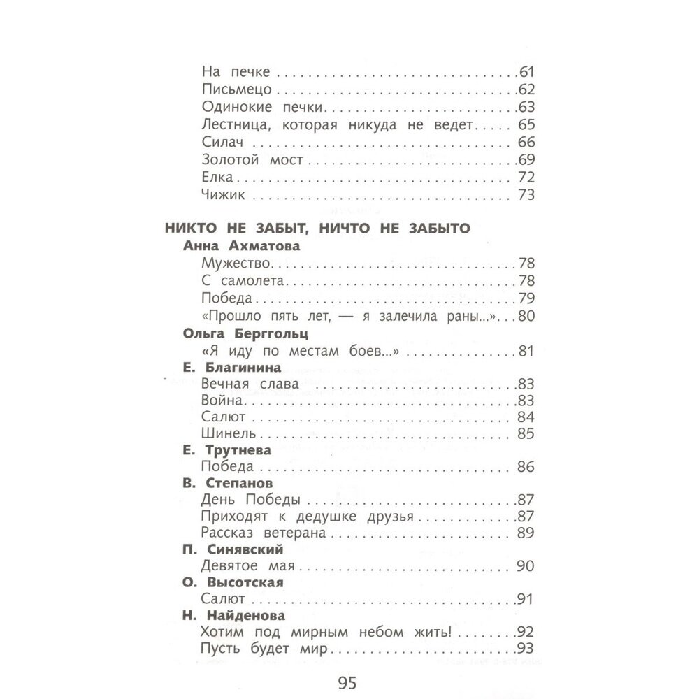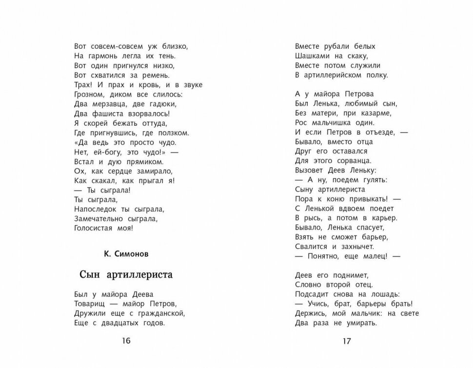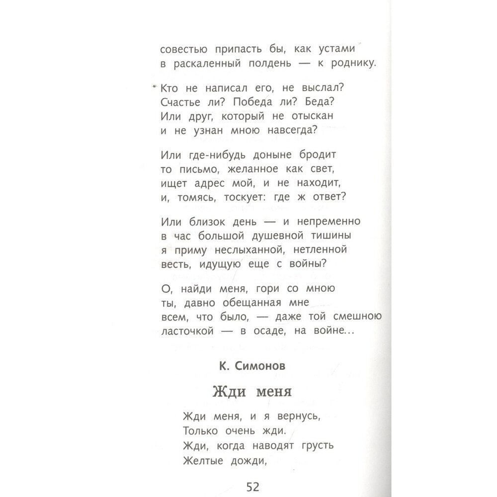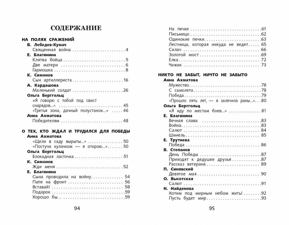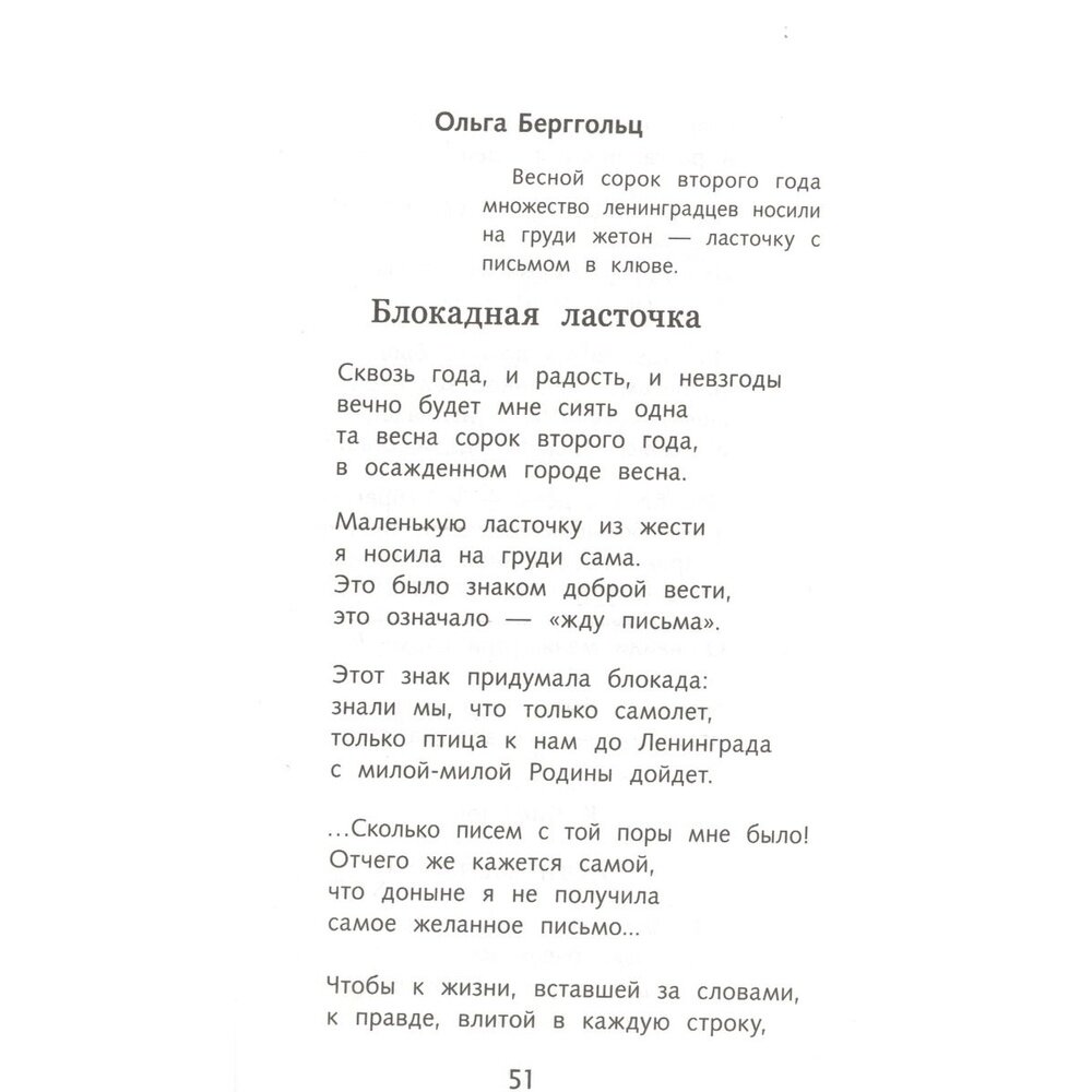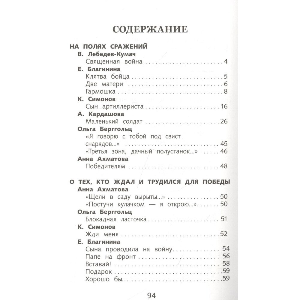 Сборник стихов, но стихов не простых - все стихотворения посвящены Великой Отечественной войне, многие написаны во время войны. Особую ценность этот небольшой сборник представляет тем, что в нём помещено 20 стихотворений от поэта с очень непростой судьбой - Елены Александровны Благининой. Все её знают как создателя простых и понятных детских стихов: "Мама спит", "Дождик дождик", "Башмачки", но в этом сборнике собраны её военные стихи, которые в годы войны были такими же популярными, как стихи Анны Ахматовой, Константина Симонова или Ольги Берггольц, которые тоже есть в сборнике. Сборник небольшой, но собраны в нём ВЕЛИКОЛЕПНЫЕ стихи, которые помогут читателю-подростку понять все ужасы войны, по новому оценить и почувствовать подвиг прадедушек и прабабушек, совершенный ими на фронте и в тылу. Сборник может помочь родителям в воспитании патриотизма у детей, если они некоторые стихи почитают вместе, разбирая то, что в 40-е годы не представляло неясностей ни для взрослых ни для детей, а сегодня требует уже определенных пояснений. Строчки некоторых стихотворений могут стать жизненными девизами для подростков, важными личностными установками. "Шинель", "Мужество", "Победителям" "Вечная слава" - стоит не только прочитать в семейном кругу, но и выучить. Это очень хорошие стихи.