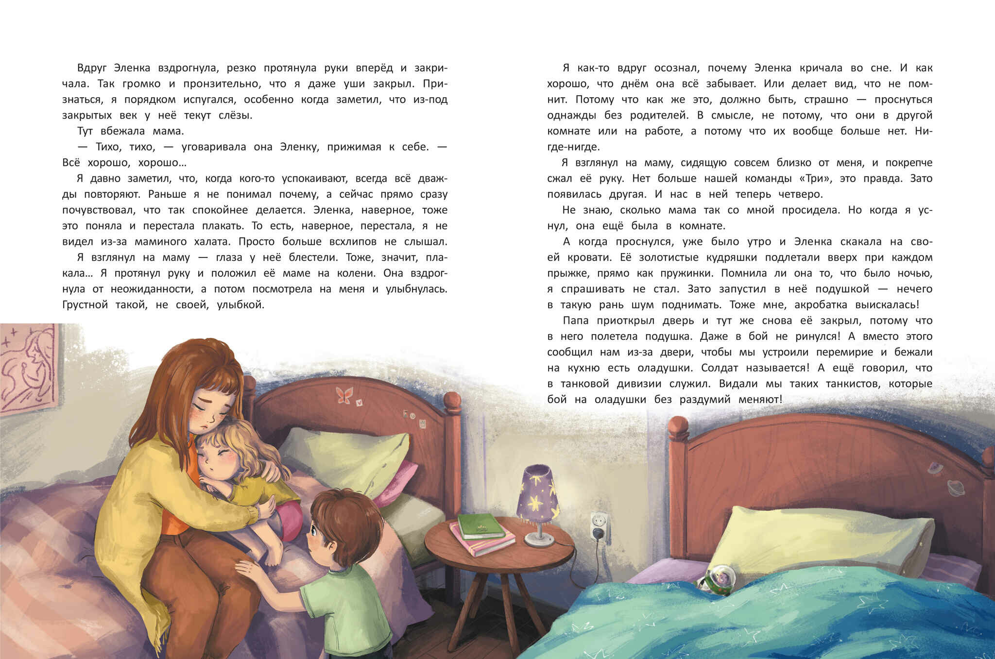 дочке 6 лет была непонятна в плане сюжета и много раз объясняла, что к чему. Книга не зашла ребёнку. Мне книга больше понравилась, описывает чувства и эмоции брата, интересно читать лично мне, как взрослому, потому что у нас сейчас этапы ревности к младшему брату. в конце я откровенно рыдала. По итогу книги дочь сказала, что нас было трое, теперь нас четверо и мы стали большой командой, а были маленькой. в книге однозначно несовсем глубоко затронута тема взаимоотношений детей, у которых в один день изменилась жизнь и стала общей, рассказ идёт урывками. тема детской любви с девочкой для такой тематики книги явно лишняя, дочь кстати тоже не поняла в силу возраста всю эту историю взаимоотношений мальчика и девочки и первой любвис отсылами к шуткам папы. я не могу её рекомендовать к обязательному чТению если только для общего развития.