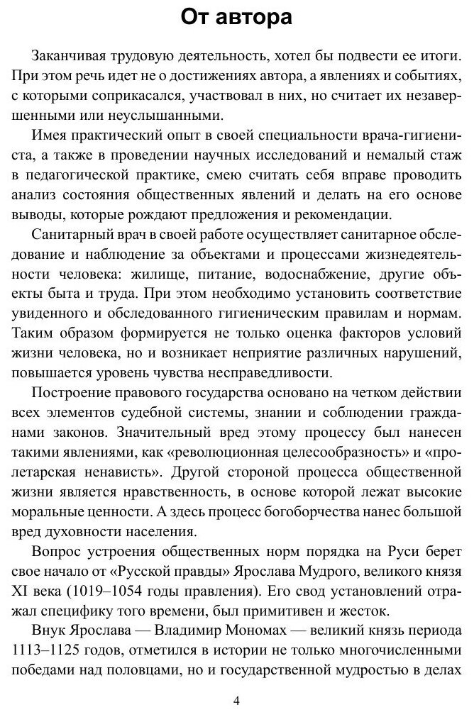 Заслуженный врач РФ, доктор медицинских наук, профессор, полковник медицинской службы, военный врач, ученый, педагог, рассматривая причины отрицательных явлений в обществе, считает, что достижения, успехи и недостатки общества зависят от «качества» человека. Гражданин должен быть воспитан на принципах законопослушания и высокой нравственности. Потребность в этих качествах личности автор предлагает отразить в Конституции страны. В этом же аспекте целесообразно рассмотреть человека как объект национальной идеи. Важное, но забытое деяние государственной значимости – гигиеническое обучение и воспитание военнослужащих требует современного решения. Выпускник Военно-медицинской академии имени С.М. Кирова, отдавший ей 25 лет трудовой жизни, настаивает на ее переименовании. Автор считает, что это должно быть имя её профессора, выдающегося хирурга с мировым признанием Н.И. Пирогова. Размышляя о человеке, автор воспринимает события, происходящие на его малой родине – Украине, как боль души…