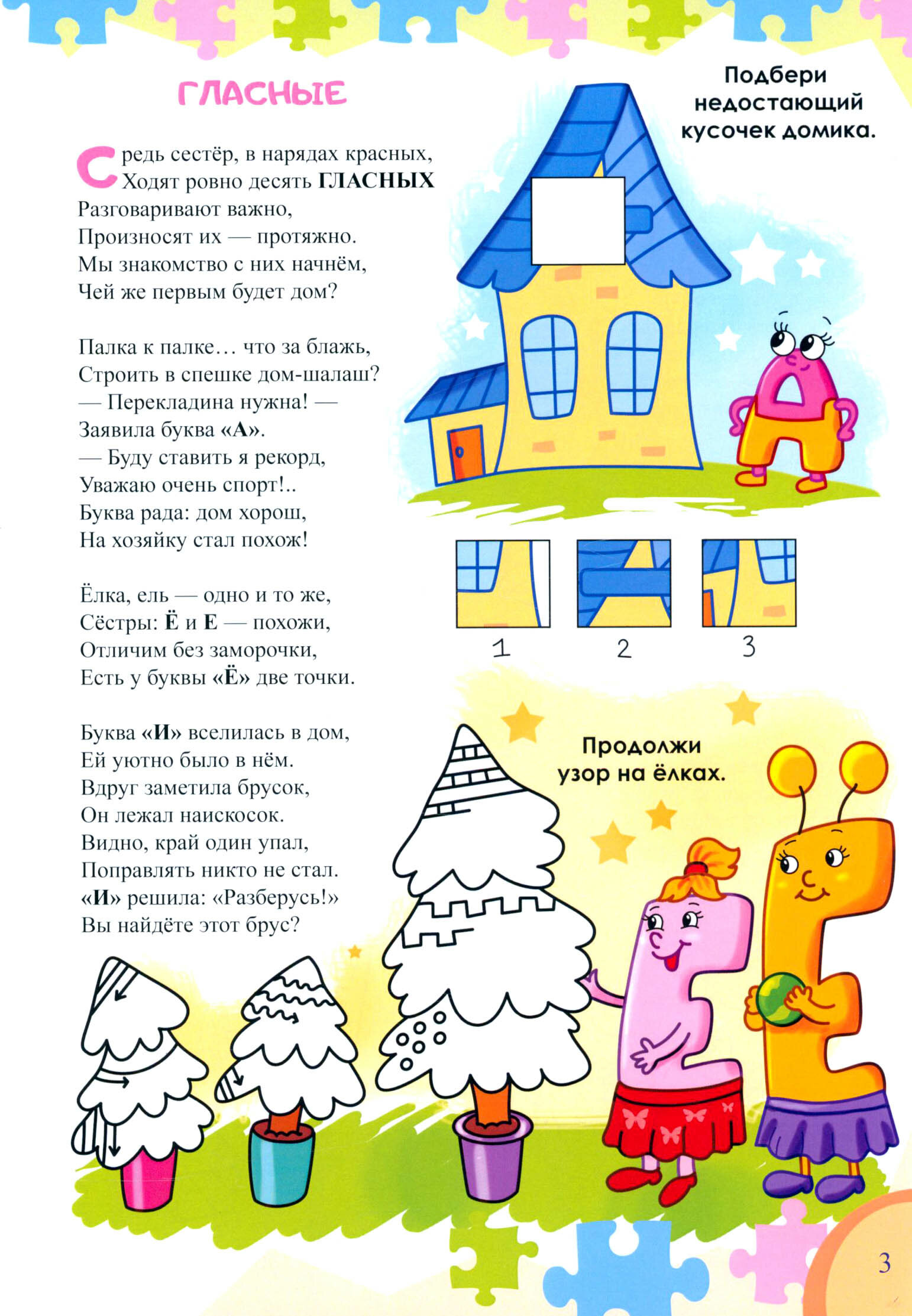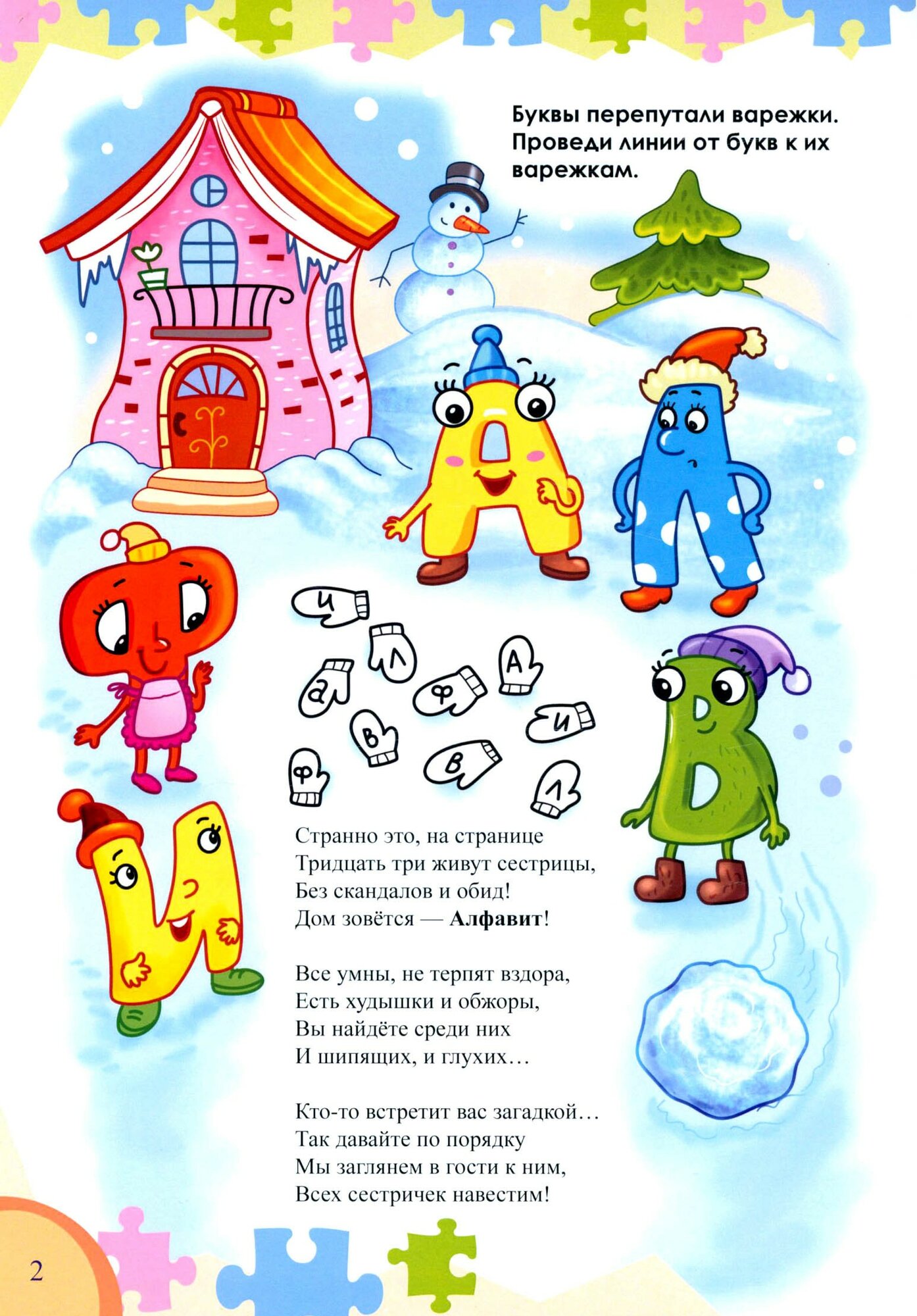 Кроме заданий здесь есть стихи - и не просто отдельные четверостишия, а а целая сказка в стихотворной форме. Каждая буква - отдельный персонаж, так детям проще и интереснее будет запоминать алфавит.