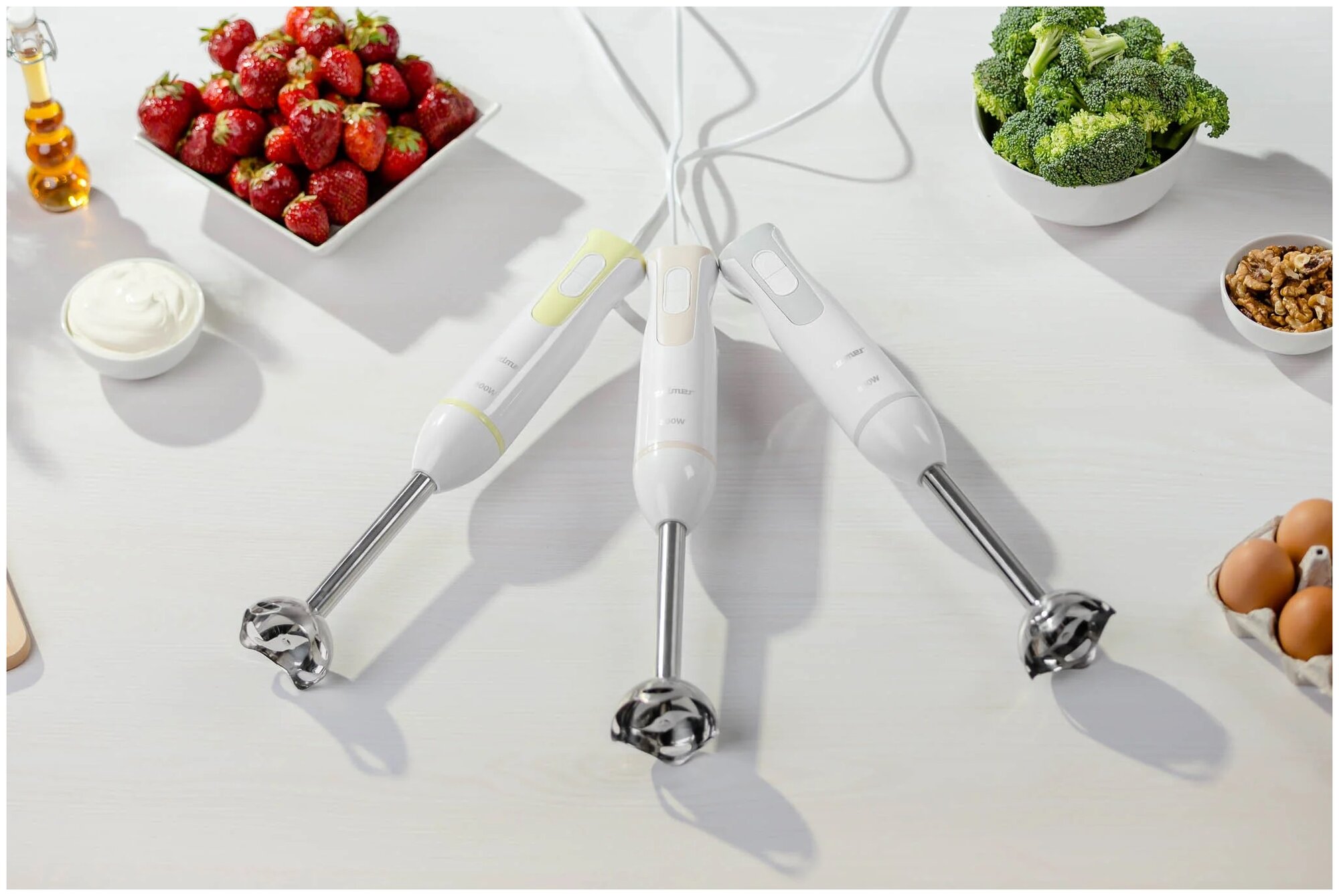 Блендер в шикарном белом цвете, мерный стакан по объёму очень мне подходит, думала будет маловат для семьи, но нет, самое то, измельчитель работает на ура, ножи острые, лук, чеснок, орехи и даже сухари измельчаем на ура. Работает практически безумно, что тоже очень порадовало в нем, шнур длинный, скорости работают отлично. Мне очень понравилась покупка, нисколько не разочарована. Берите, не пожалеете.