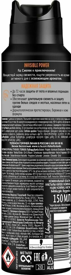 Описание товара:Fa Men Invisible Power – экстремальная защита от пота, запаха, а так же белых, желтых и масляных пятен на одежде. Инновационная формула с технологией Sweat Detect борется с потом еще до его появления. Научно доказано: 72ч защиты от пота и запаха. 0 % спирта. Хорошая переносимость кожей подтверждена дерматологами. Также почувствуйте притягательную свежесть, принимая душ с гелем для душа Fa Men Xtreme.Состав товара:Butane, Propane, Aqua, Aluminum Chlorohydrate, Propylene Glycol, Cyclomethicone, Isobutane, Isopropyl Myristate, Dimethicone, Parfum, PEG/PPG-18/18 Dimethicone, Phenoxyethanol, Linalool, Limonene, Hexyl Cinnamal, Citronellol, Coumarin, Citral.Меры предосторожности:Баллон под давлением. Предохранять от воздействия прямых солнечных лучей и нагревания свыше 50'C. Не разбирать и не сжигать даже использованный баллон. Не распылять вблизи открытого огня и раскаленных предметов. Держать на расстоянии от источников возгорания. Не курить. Хранить в местах, недоступных для детей. Избегать попадания в глаза и на раздраженную и поврежденную кожу. Использовать по назначению. Только полностью использованный баллон подлежит переработке. Использовать в хорошо проветриваемых помещениях. Не содержит озоноразрушающих веществ.Способ применения:Тщательно встряхните баллон, распыляйте на сухую и чистую кожу подмышек с расстояния 15 см. Не наносите на раздраженную и поврежденную кожу.