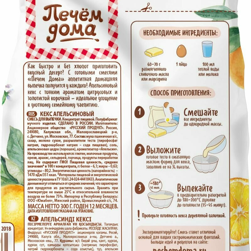| Состав | Мука пшеничная в/с, сахар, молоко сухое, разрыхлители теста (пирофосфат натрия, гидрокарбонат натрия — сода пищевая), соль, апельсиновая цедра (порошок), ароматизатор «Апельсин» |