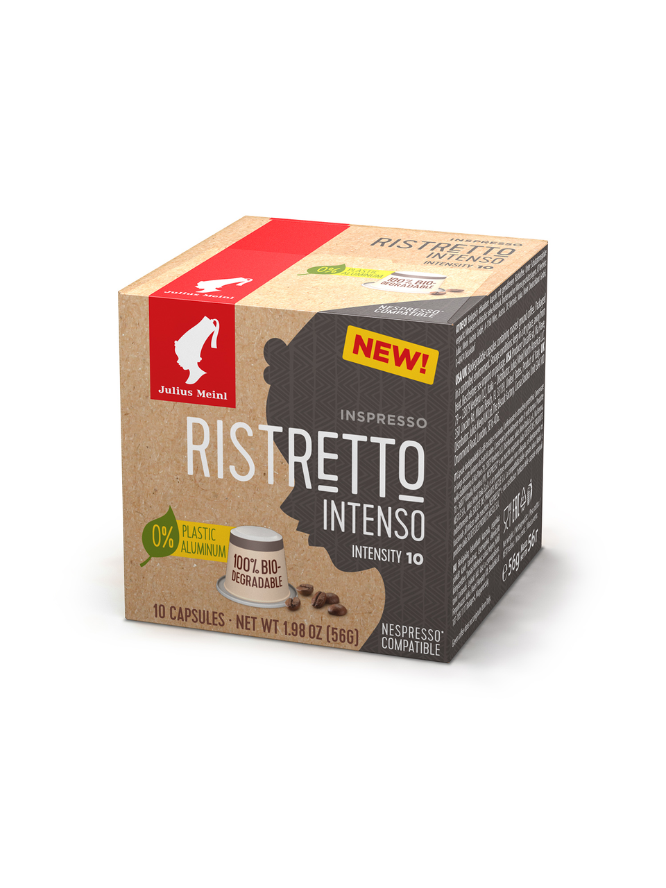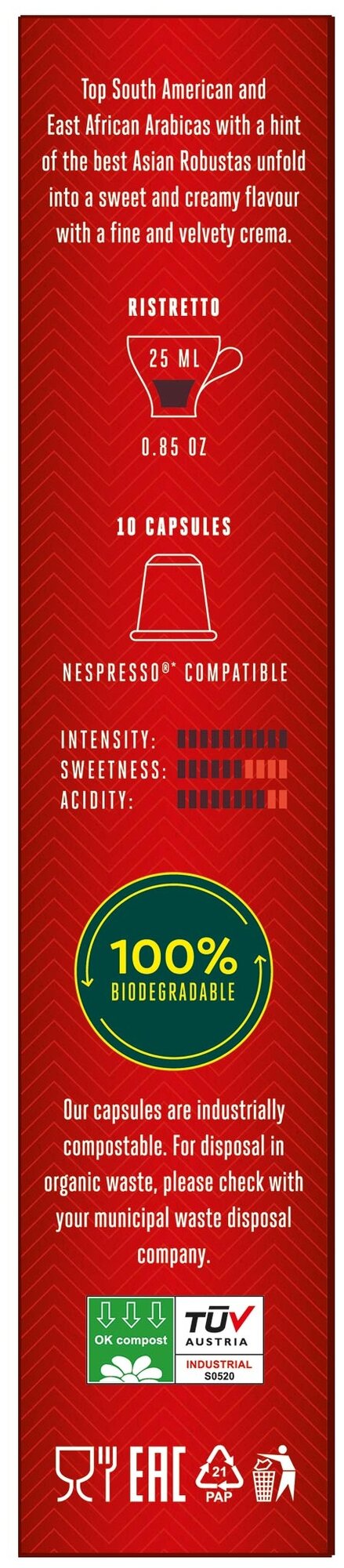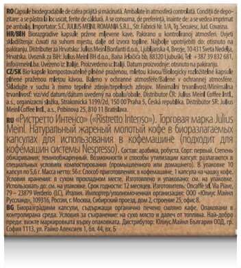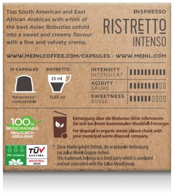 Julius Meinl Ristretto Intenso - уникальная смесь арабики, собранной на высокогорных склонах Восточной Африки и Южной Америки и небольшого количества зерен азиатской робусты. Кофейный напиток обладает сладким кремовым вкусом и очень стойким ароматом. 100% биоразлагаемые кофейные капсулы идеально сочетаются с кофемашиной Nespresso. Выпускается в удобной упаковке по 10 капсул. Интенсивность: 10 Кислотность: 8 Сладость: 8
