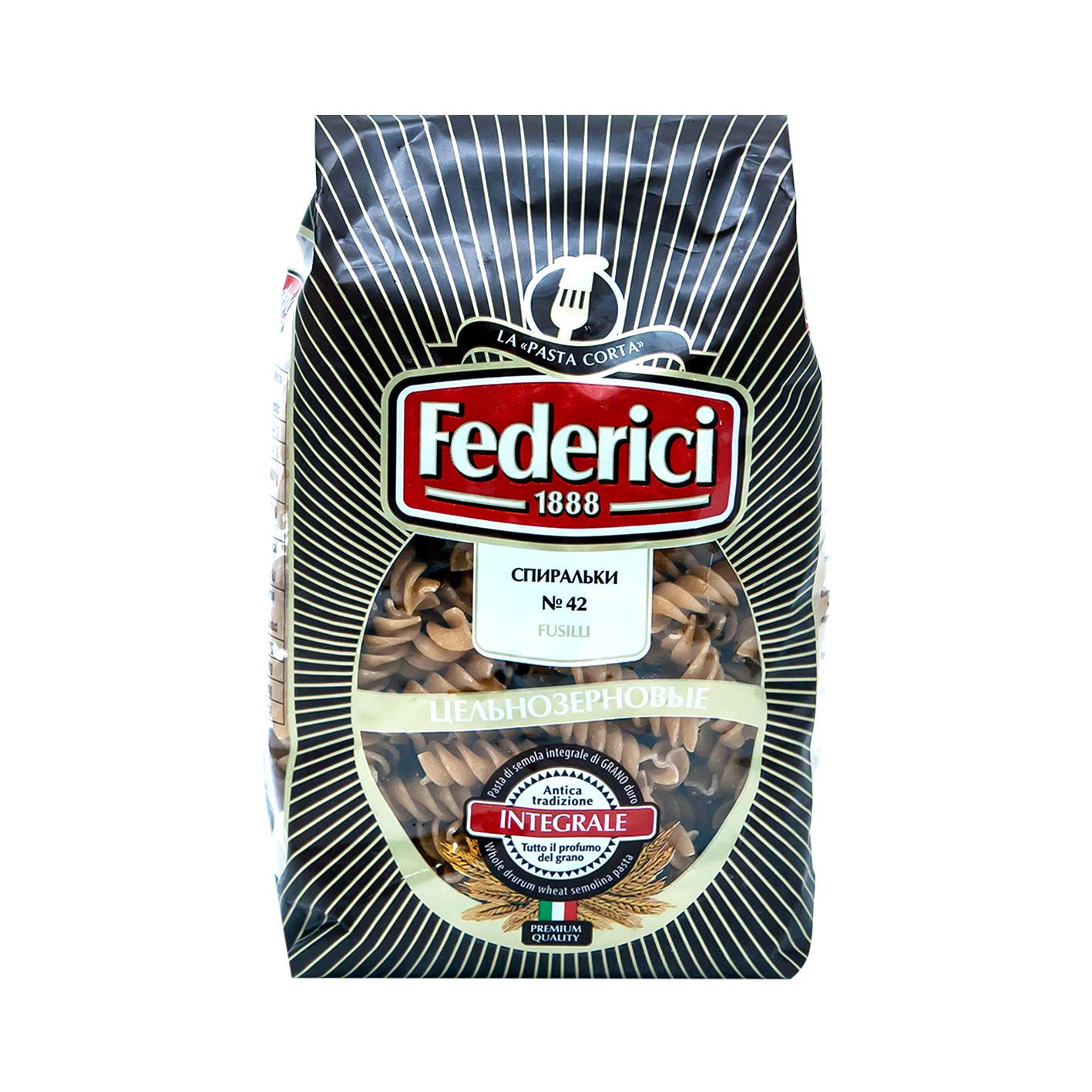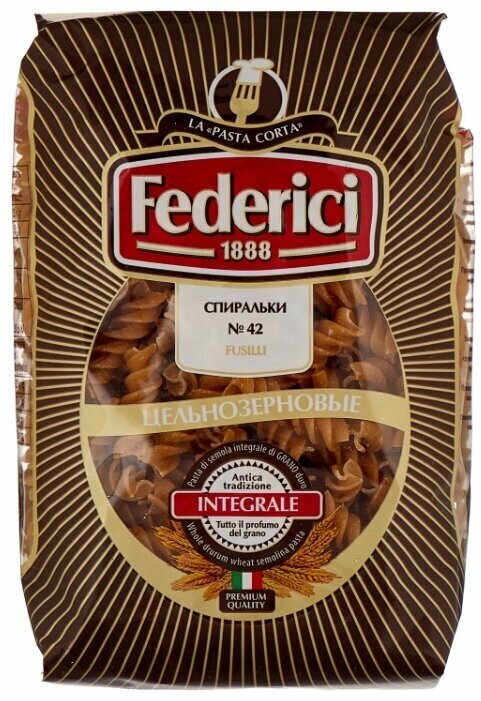 Fusilli (Спирали) - популярный итальянский формат макарон, такая форма отлично задерживает начинку в изгибах и проникает внутрь пасты, делая ее вкус более насыщенным. Federici №42 Fusilli (Спиральки) производятся из пшеничной цельнозерновой муки класса «А», такая мука производится из неочищенного зерна, в ее составе не только зародыш, но и его внешняя оболочка, отруби. Изделия из цельнозерновой муки содержат большое количество полезных для организма микроэлементов, таких как кальций, магний, калий, фосфор, цинк и многие другие, а также витамины E, PP, группы B. Они рекомендованы диетологами, потому как являются отличным источником клетчатки. Их следует подавать вместе с салатом из свежих овощей, или с легкими томатными и овощными заправками, также хороши в качестве гарнира к мясу, птице или рыбе.