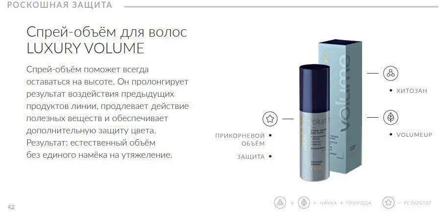 Линия Luxury Volume — самый лёгкий и эффективный способ надолго придать волосам соблазнительный объём, а также дополнительно восстановить повреждённые участки волос и защитить их цвет.