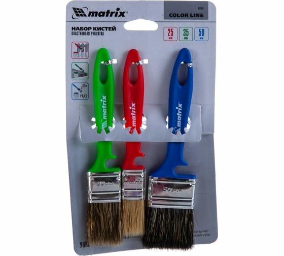 Набор кистей «Универсальный» 25 мм, 35 мм, 50 мм MATRIX Color Line состоит из трех кистей, которые имеют специальный состав волокон. Идеально подходит для работ по дереву, с ЛКМ на водной основе и эмалью. Каждая кисть имеет специальное углубление на рукоятке для удобного крепления на банку с краской. Повышенное качество инструмента, износостойкость, эластичность и память щетины. Пластиковые клинья увеличивает срок службы кисти в несколько раз, предотвращают деформацию инструмента при замачивании. Уникальный клеевой рецепт эпоксидной смолы фиксирует щетину при работе с агрессивными ЛКМ. Возможность крепления на банку с краской, малярное ведро или ванночку. Рукоятка смоделирована для продолжительных работ, поэтому при длительной покраске не устает рука.