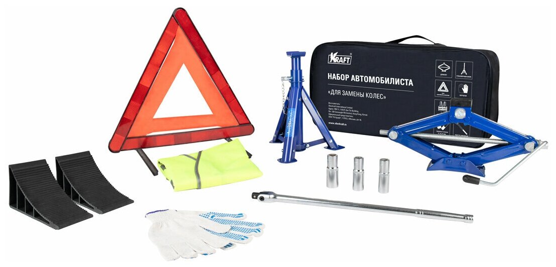 Данный набор KRAFT (крафт) предназначен для замены колес и технического обслуживания автомобиля. Состав: ромбический домкрат 105-390 мм грузоподъемностью 1,5т. Опорная часть домкрата изготовлена из прочной эластичной резины для защиты дна. Страховочная опора, удерживающая груз до 2т, шарнирный вороток 1/2" 457мм, глубокие торцевые головки 17, 19 и 21 мм. Набор комплектуется парой перчаток знаком аварийной остановки светоотражающим жилетом. Весь инструмент упакован в сумку для транспортировки и хранения. В разделе авто товаров ТМ KRAFT (Крафт) можно встретить большое разнообразие домкратов, отличающихся по способу действия и характеристикам. Широкий ассортимент включает в себя гидравлические бутылочные, гаражные подкатные, механические ромбические, механические бутылочные, реечные и электрические домкраты. В каждой группе представлено множество разнообразных моделей, отличающихся рабочими характеристиками и принципами работы, подходящих для бытового и для профессионального использования