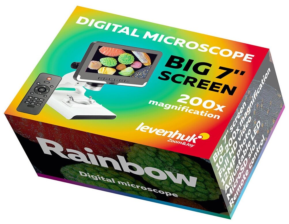 Цифровой микроскоп Levenhuk предназначен для изучения крупных объектов, а также фотографирования и видеозаписи исследований. С его помощью можно изучать минералы, текстиль, насекомых, части растений, небольшие механизмы и электронику. Микроскоп снабжен комбинированной подсветкой, поэтому позволяет проводить наблюдения и в проходящем, и в отраженном свете. Дополнительный плюс – микроскопом можно управлять через беспроводной пульт. Вместо классических окуляров в этом микроскопе установлен большой 7-дюймовый ЖК-экран (диагональ около 18 см). Картинка выводится в цвете, она контрастная и высокодетализированная. Доступно цифровое и оптическое увеличение. Общий диапазон кратности составляет от 10 до 200 крат, оптический – от 10 до 50 крат. Также микроскоп дает возможность делать фото в качестве 12 Мпикс и записывать видео в разрешении Full HD. Запись ведется на карту памяти, которая приобретается отдельно. Предметный столик снабжен зажимами. Подсветка расположена сверху и снизу, поэтому рассматривать можно образцы любой степени прозрачности. Есть регулировка яркости. Управлять микроскопом можно при помощи кнопок на корпусе или используя пульт дистанционного управления. Пульт многофункциональный, среди прочего он позволяет регулировать яркость подсветки, выбирать увеличение, запускать запись видео, фотографировать. Дополнительно микроскоп комплектуется базовым набором готовых микропрепаратов. Основные особенности: Диагональ встроенного экрана – 7 дюймов, возможность поворота. Цветное изображение, запись фото и видео в высоком разрешении. Светодиодная подсветка с регулировкой яркости. В комплекте готовые микропрепараты для проведения исследований. Беспроводной пульт управления дает доступ ко множеству функций микроскопа. Комплектация: микроскоп с ЖК-экраном, предметный столик с зажимами и предметными стеклами, инфракрасный пульт дистанционного управления, готовые микропрепараты: крыло саранчи (Locust wing), крыло пчелы (Honeybee wing), ножка пчелы (Honeybee leg), микроскопическая водоросль (Laver), стебель сосны (Pine tree stem), стебель гвоздики (Carnation stem), перо канарейки (Canary feather), коровий волос (Cow hair), чешуя золотой рыбки (Goldfish scale), зерно картофельного крахмала (Potato starch), стебель кукурузы (Corn stem), кожица лука (Onion epidermis), кабель питания, сетевой адаптер, инструкция по эксплуатации и гарантийный талон.
