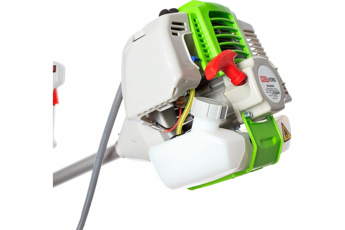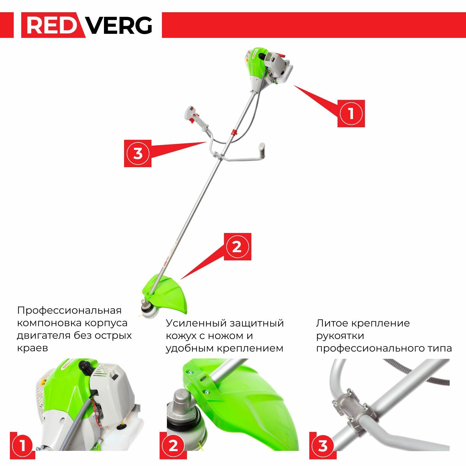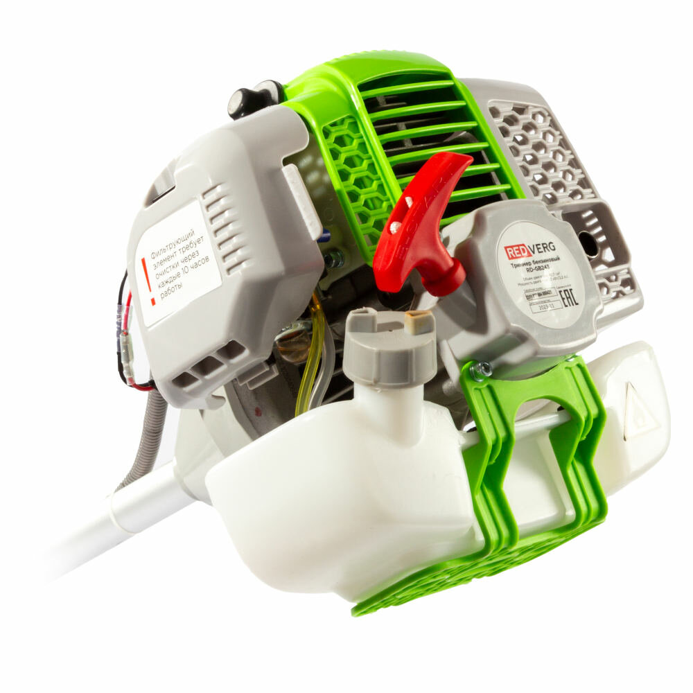 Бензиновый садовый триммер RedVerg (6615383) – это инструмент, предназначенный для поддержания в надлежащем виде значительных по площади садовых и приусадебных участков. Режущими элементами являются леска и нож. Их выбор зависит от типа уничтожаемой поросли.