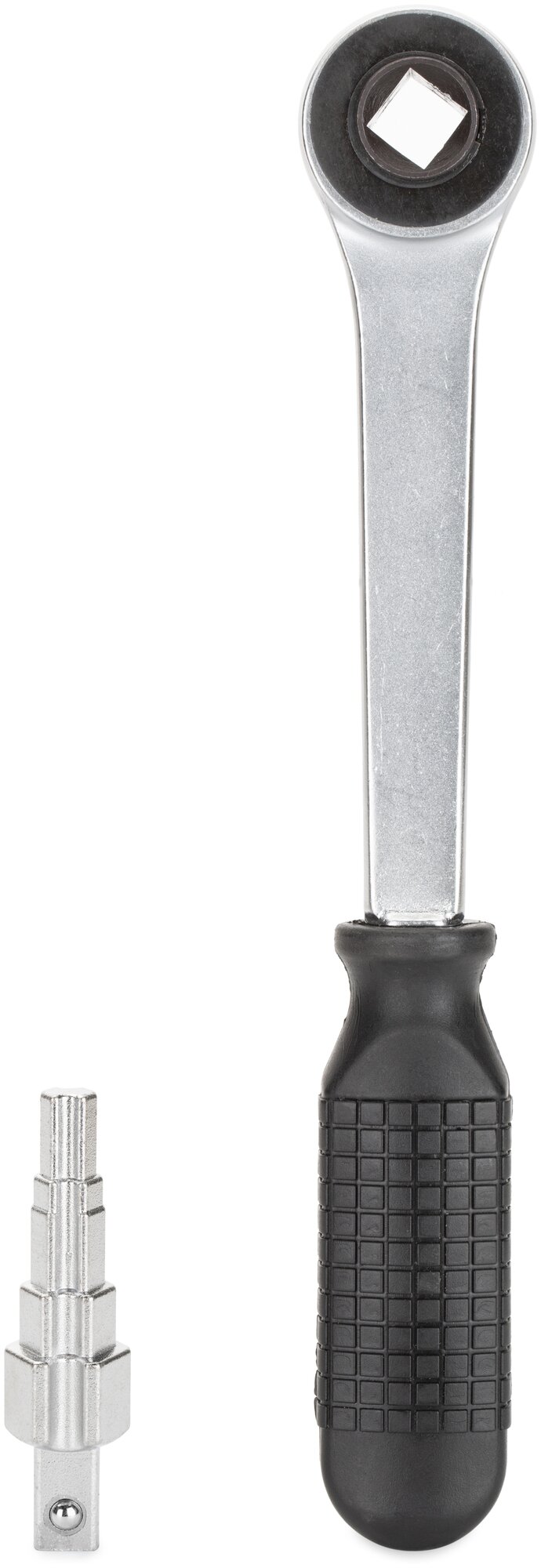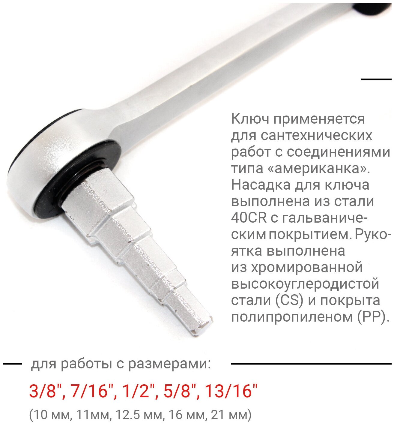 Ключ ступенчатый с размерами 3/8'' -7/16''- 1/2'' - 5/8'' - 13/16'' с трещоточной рукояткой. Головку ключа можно вставлять с разных сторон (для откручивания и закручивания).