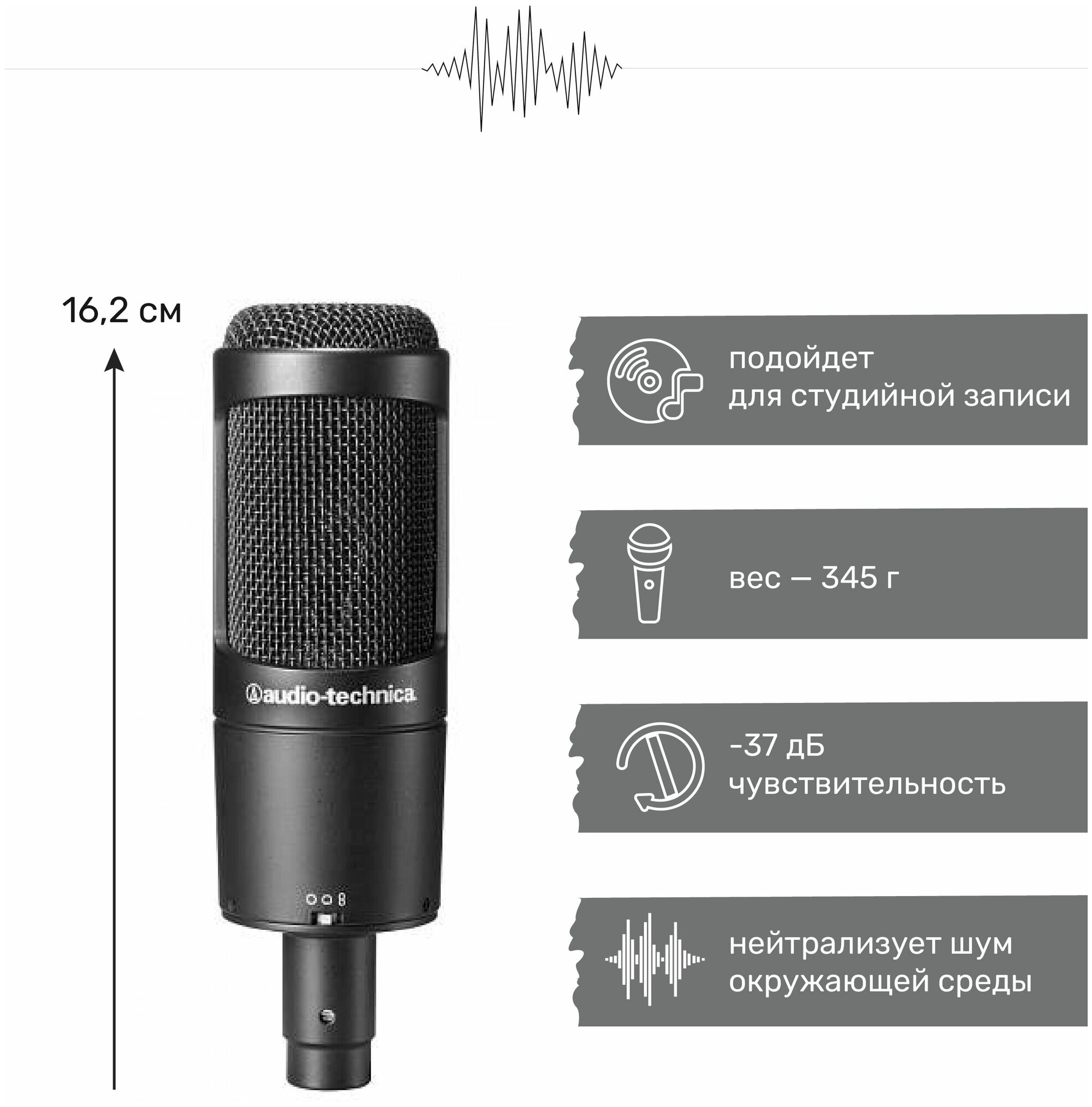 Вполне нормальный для своей стоимости микрофон. Конечно, в сравнении с моделями, стоящими в разы дороже, AT2020 звучит явно беднее, поэтому не нужно ожидать от него чего-то волшебного. Звучит ярко - подойдёт для записи голоса и струнных инструментов