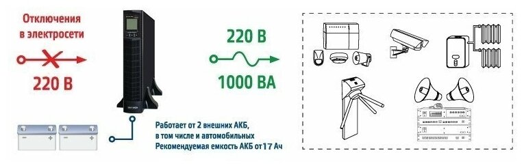 220 В, 1000 ВА (900 Вт), On-Line, синусоидальная форма выходного напряжения, световая и звуковая индикация режимов работы, ЖК-дисплей, необходимое количество АКБ для работы — 2 шт. (24 В). минимальная требуемая ёмкость 17 Ач. Ток заряда АКБ — 6 А. Дистанционный мониторинг по RS 232, USB, порт для платы релейного интерфейса. Возможность подключения SNMP-модуля DL-801. Функция удаленного аварийного отключения выходного напряжения (EPO). Корпус под 19" шкаф, высота 2U или настольная установка.