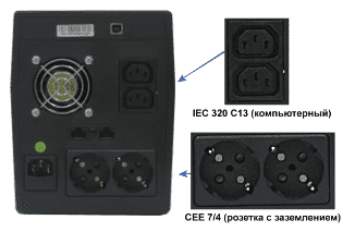 | Тип выходных разъемов питания | евророзетка + компьютерная (IEC C13) |