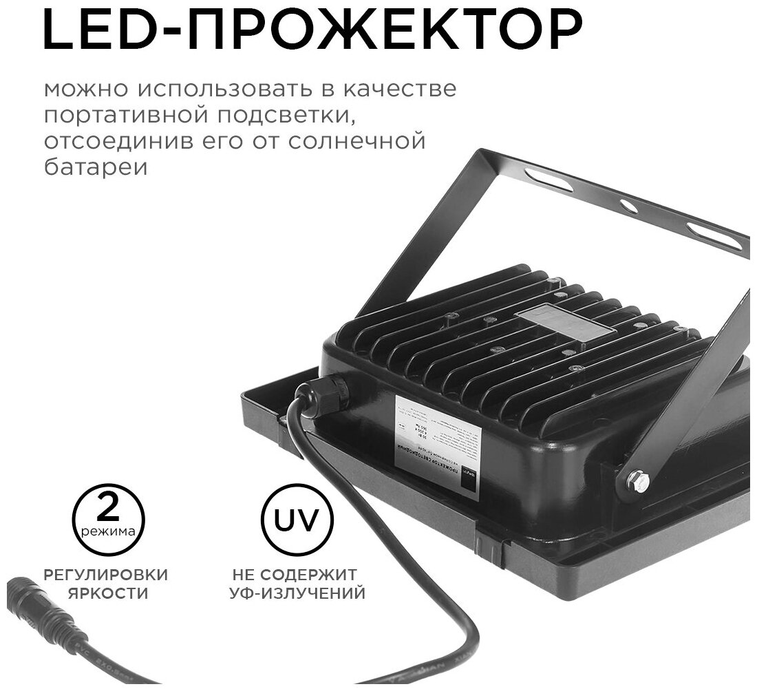 Светодиодный прожектор 05-34 излучает световой поток в 360 Лм, потребляя при этом 30 Вт, благодаря чему отлично подойдет для освещения небольшой площади, например, у входа в дом или иную постройку. В прожекторе используются светодиоды с дневным белым цветом свечения и цветовой температурой 4200К, которая наиболее близка к естественному солнечному свету и все более востребована на рынке. Пластиковый корпус прожектора изготовлен с размерами 204х160х54мм, а рассеивателем служит закаленное боросиликатное стекло, устойчивое к механическим и температурным воздействиям. Угол рассеивания прожектора равен 120 град., что позволяет освещать широкую площадь даже при установке на небольшой высоте. Светильник снабжен аккумулятором с емкостью 6000 mAh, который заряжается от солнечной батареи в солнечный день за 4-6 часов. Солнечная батарея идет в комплекте с прожектором и подключается с помощью провода длиной 3 м. Также в комплекте поставляется пуль ДУ, передающий сигнал по ИК-каналу. С помощью пульта можно выбрать автоматический режим, в котором прожектор будет сам включаться при низком уровне освещенности и выключаться, когда станет светлее. Также можно включить/выключить прожектор и отрегулировать яркость свечения. Заряженный прожектор можно отключить от солнечной батареи и использовать как переносной источник свечения.