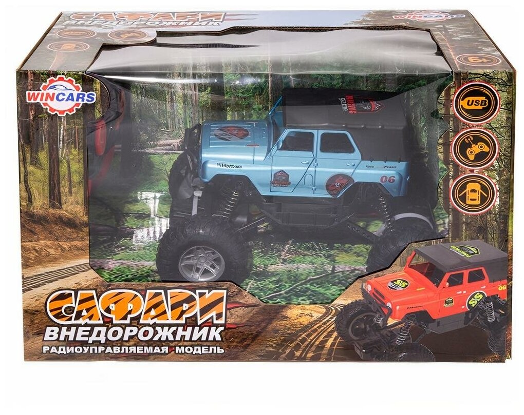 Радиоуправляемый внедорожник на больших колесах с открывающимися дверями и задним приводом, отлично детализирован. Управляется пультом на частоте 2.4 ГГц, может подзаряжаться с помощью USB. В ассортименте модели красного и синего цвета.