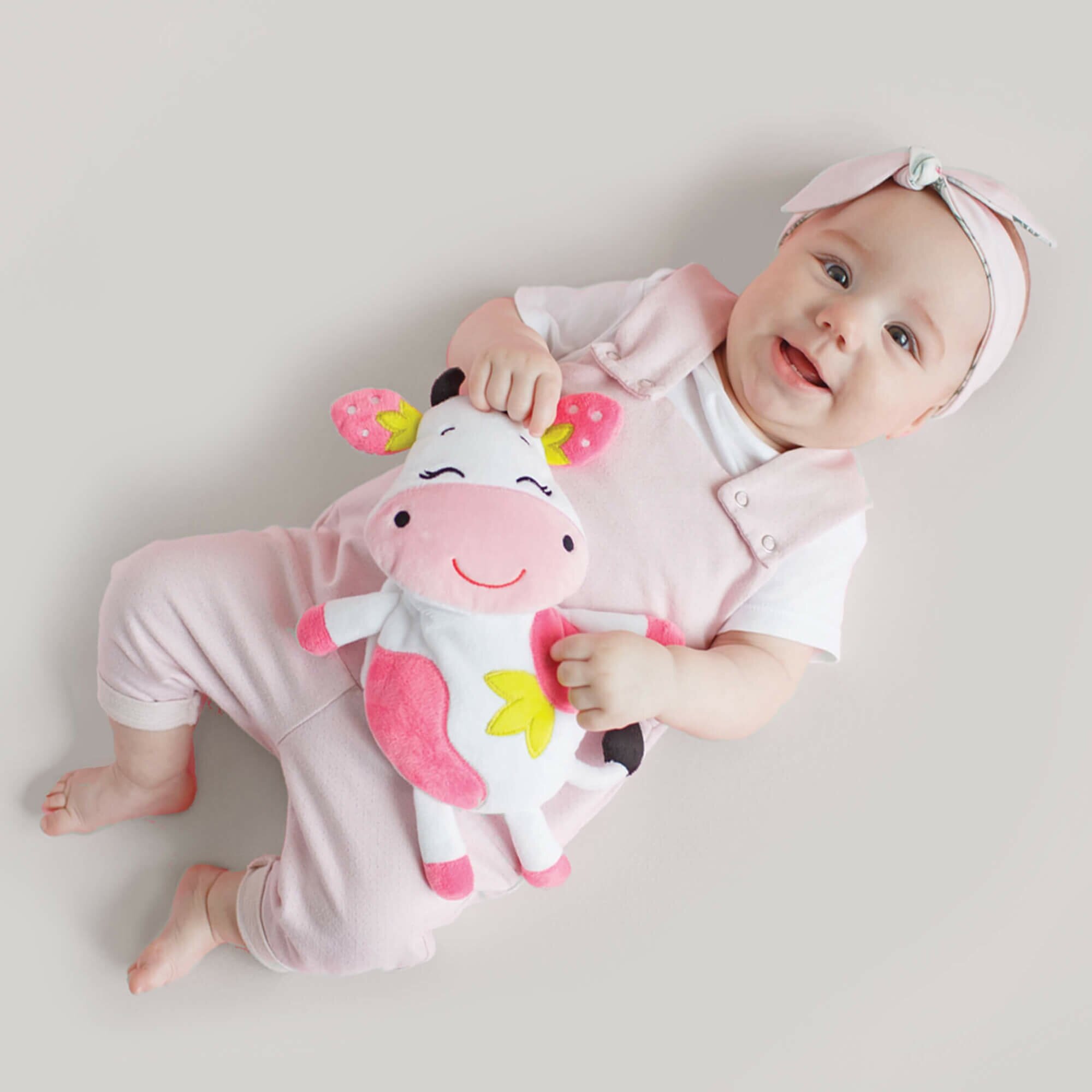 Плюшевая игрушка грелка Клубничная Корова с вишневыми косточками не просто веселая игрушка, а незаменимый помощник для мамы грудничка. Тепло вишнёвых косточек снимает боль от колик и устраняет спазмы. Разогрейте льняной вкладыш с косточками в СВЧ печи 40 секунд, и детская грелка готова к использованию. Благодаря свойствам вишневых косточек игрушка грелка долго отдает тепло, и также может служить холодным компрессом при ушибах. Обнимая ее, малыш быстро успокаивается и засыпает, позволяя маме отдохнуть. Еще одно важное свойство мягкой игрушки развитие мелкой моторики у малыша. На Фабрике игрушек Мякиши учли все, создавая игрушки для новорожденных гипоаллергенные материалы в составе, яркие цвета, милая мордочка и добрые глазки. Клубничная Корова станет ребенку и маме другом, который справится с болью, поиграет, успокоит и украсит детскую комнату. Грелка идеально подойдет в подарок на выписку для новорожденного.