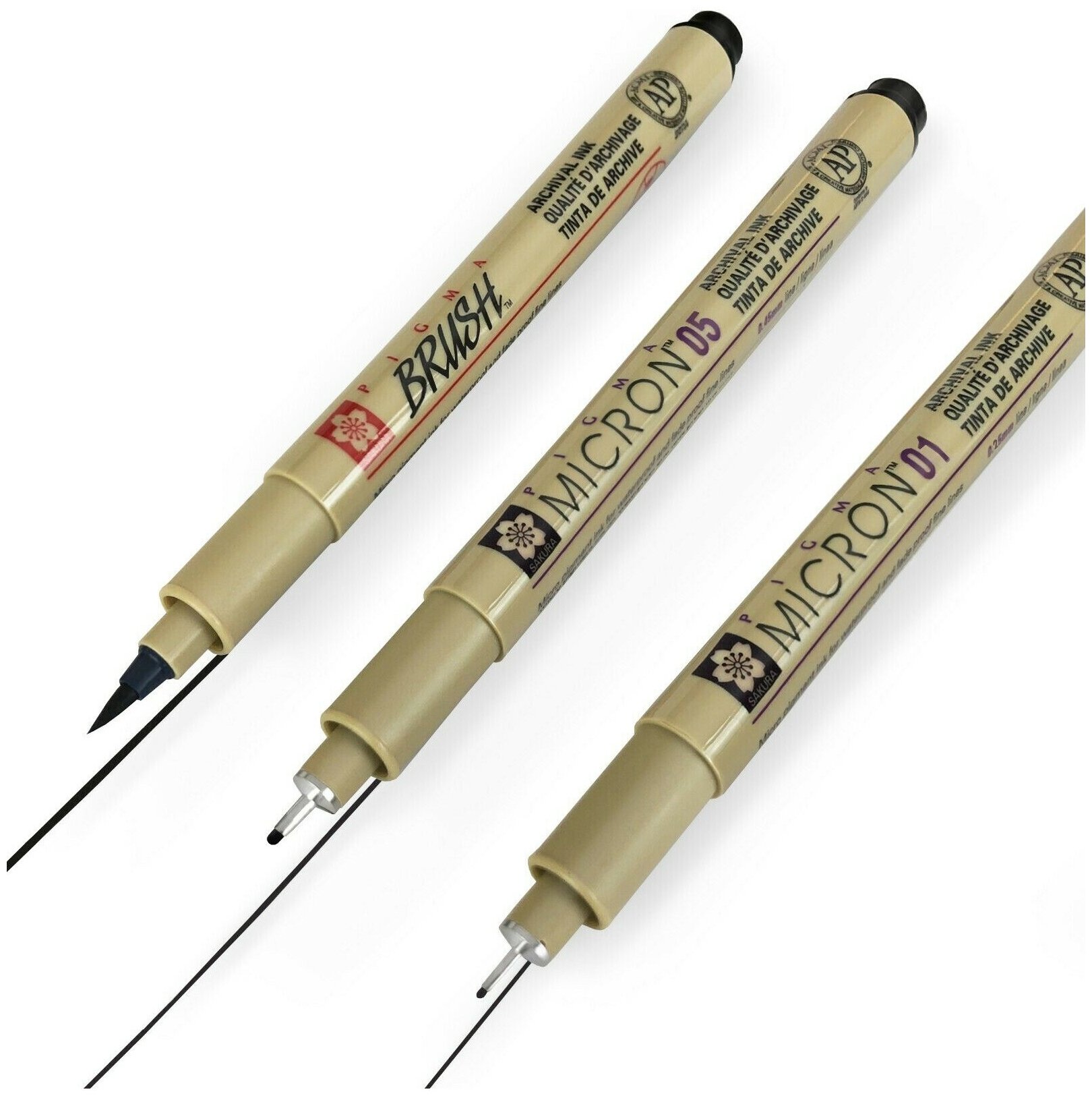 В составе набора: 2 черные капиллярные ручки Sakura Pigma Micron 0.25 м, 0.45 мм и 1 черная ручка с наконечником-кистью Pigma Brush.