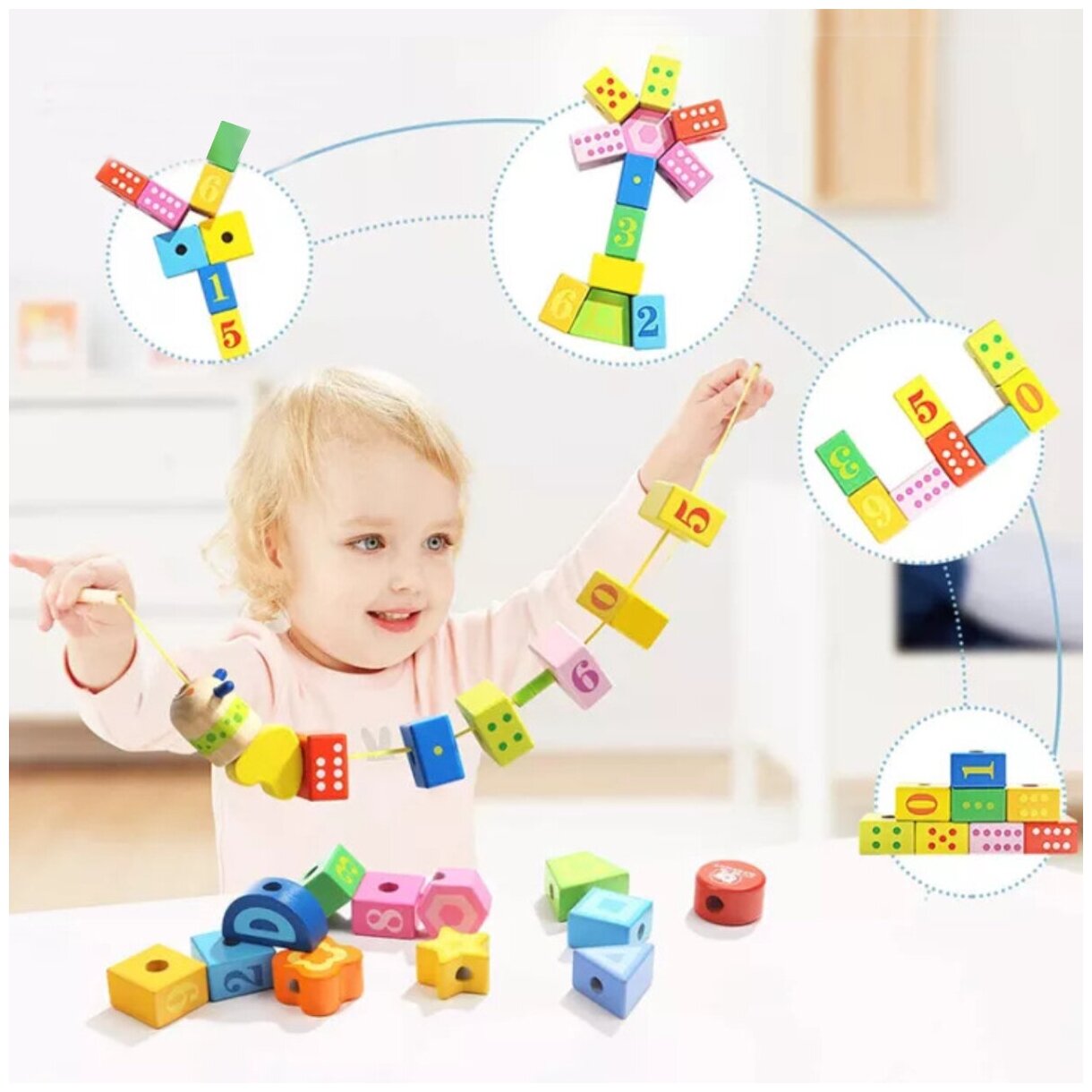 В набор входит 20 разноцветных деталей разнообразных форм и цветов, шнуровка. Игры со шнуровкой способствуют развитию мелкой моторики и зрительно-моторной координации.