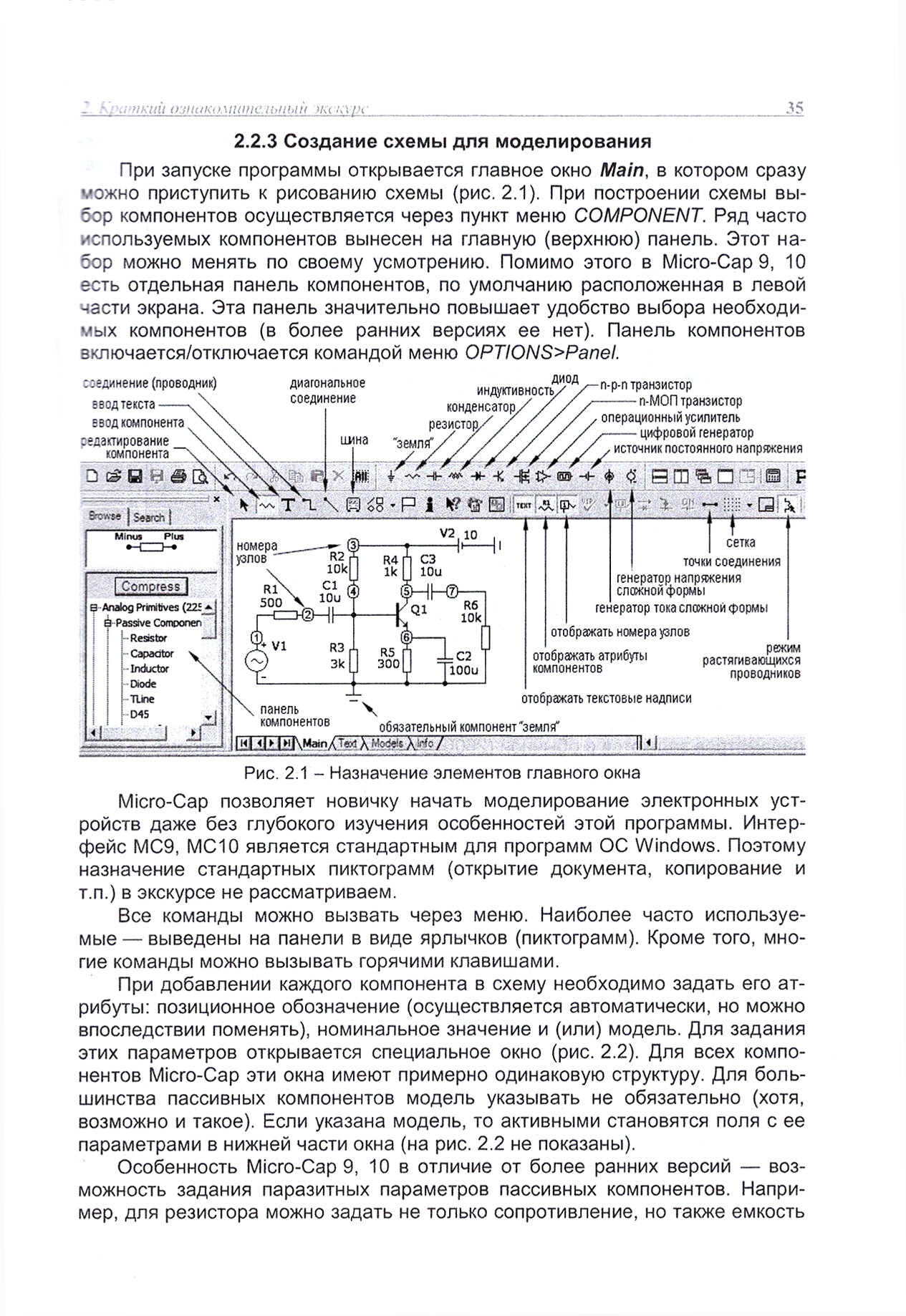 Изложены практические рекомендации, существенно упрощающие процесс получения работоспособных моделей сложных электронных схем. Описаны параметры моделей компонентов и способы создания моделей на основе справочных параметров. Подробно изложены особенности моделей цифровых компонентов. Рассмотрен порядок синтеза пассивных и активных фильтров. Описание возможностей программы сопровождается большим числом примеров, иллюстрирующих построение схем моделирования, способы задания электронных компонентов, проведение различных видов анализа и обработку полученных результатов.