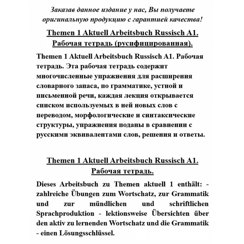 Трехуровневый курс Themen aktuell разработан для взрослых, начинающих базовое изучение немецкого языка как иностранного (Pre-A1 – B1). Курс нацелен на улучшение коммуникативных навыков и отработку понимания текстов: общение в повседневных ситуациях, беседы на актуальные темы, понимание прочитанных простых литературно-художественных и научно-популярных текстов или восприятие их на слух.