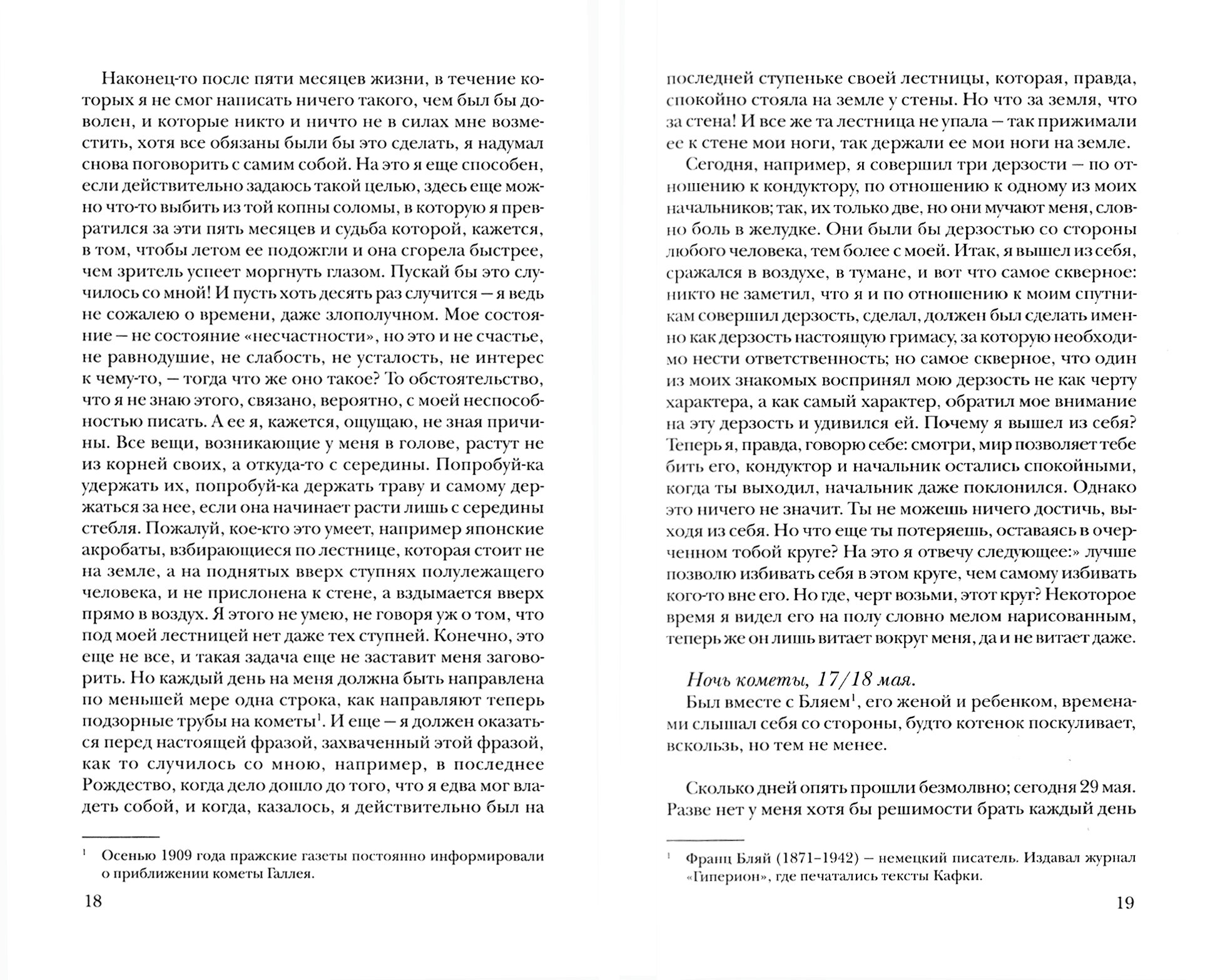 В книгу немецкого и австрийского писателя Франца Кафки (1883-1924) вошли фрагменты из его дневников 1910-1923 гг. и «Письмо отцу» в переводе советской и российской переводчицы, литературоведа-германиста Евгении Александровны Кацевой (1920-2005). В сборнике также публикуется литературоведческое исследование Кацевой о дневниках писателя, которые переводчица считала главной частью его творчества.