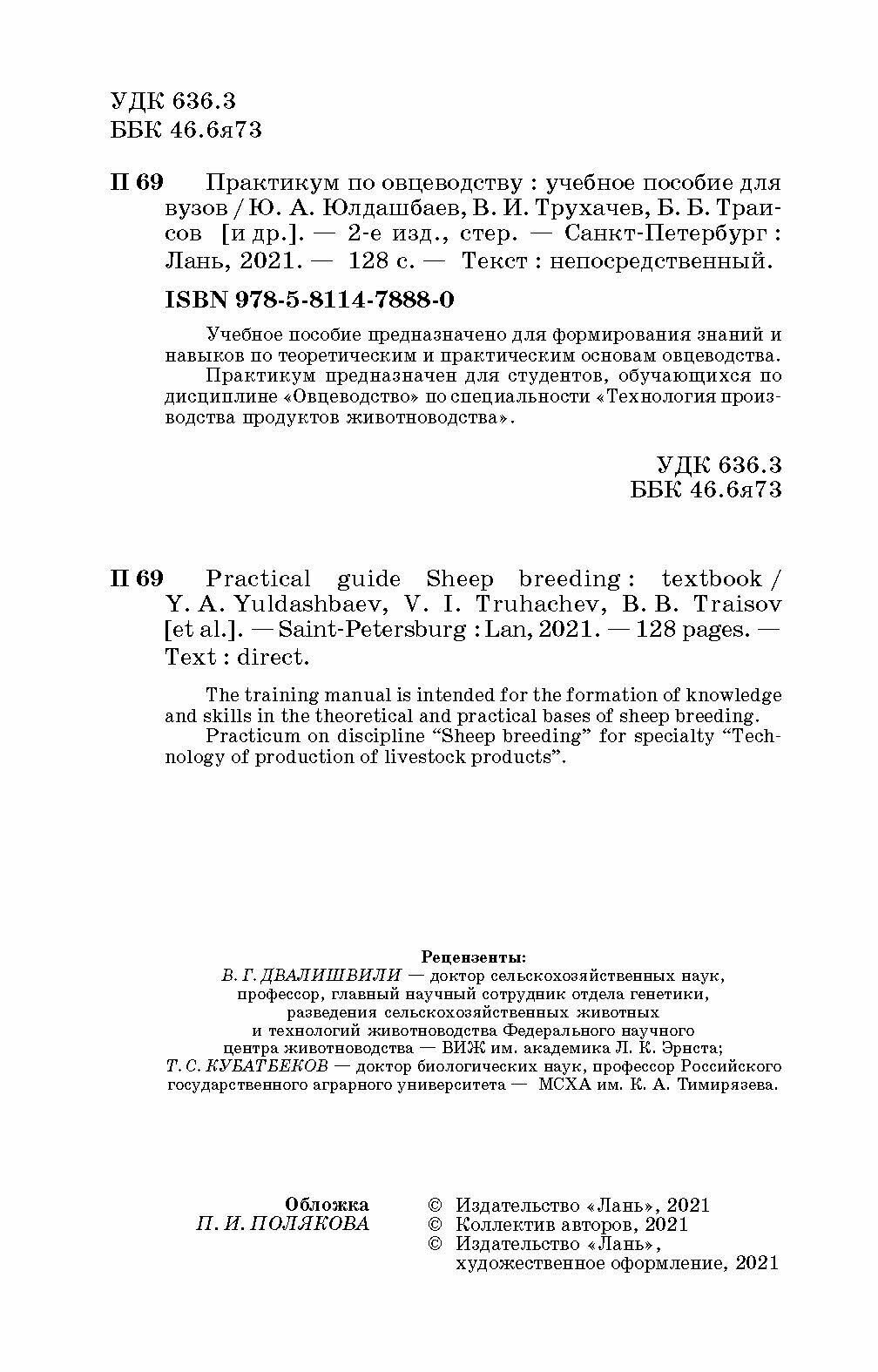 Практикум по овцеводству. Учебное пособие ("Юлдашбаев Юупжан Артыкович; Юлдашбаев Юсупжан Артыкович; Трухачев Владимир Иванович; Траисов Балуаш Бакишевич; Есенгалиев Кайрлы Гусмангалиевич; Смагулов Дархан Бакытбекович; Бейшова Индира Салтановна; Чылбак-оол Салбак Олеговна; Ахметова Асель Куттбаевн); Лань, 2021