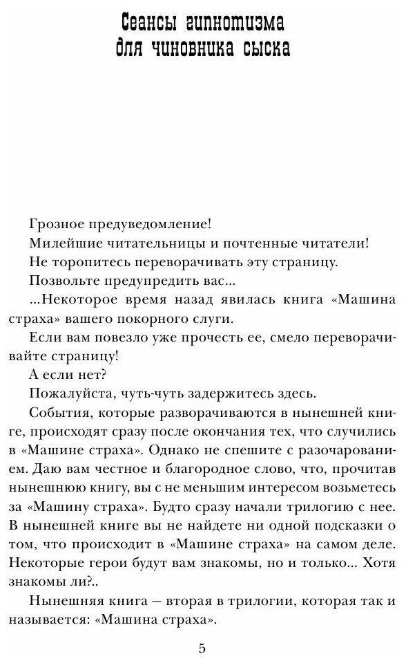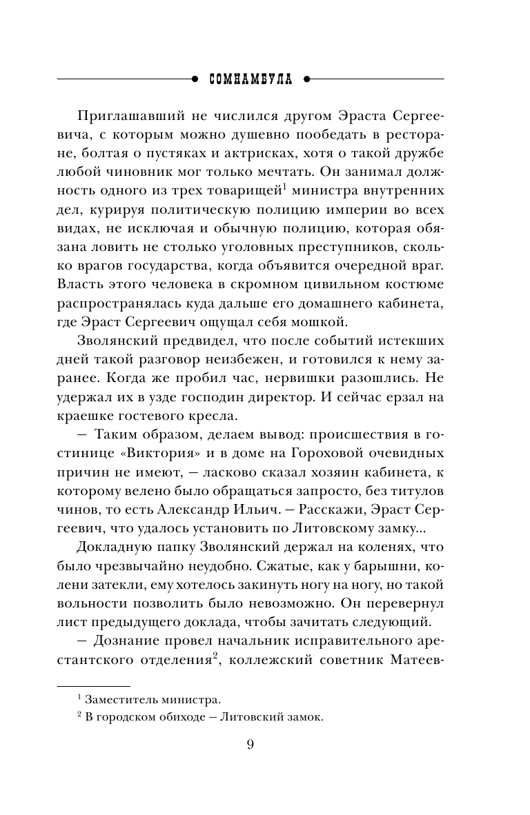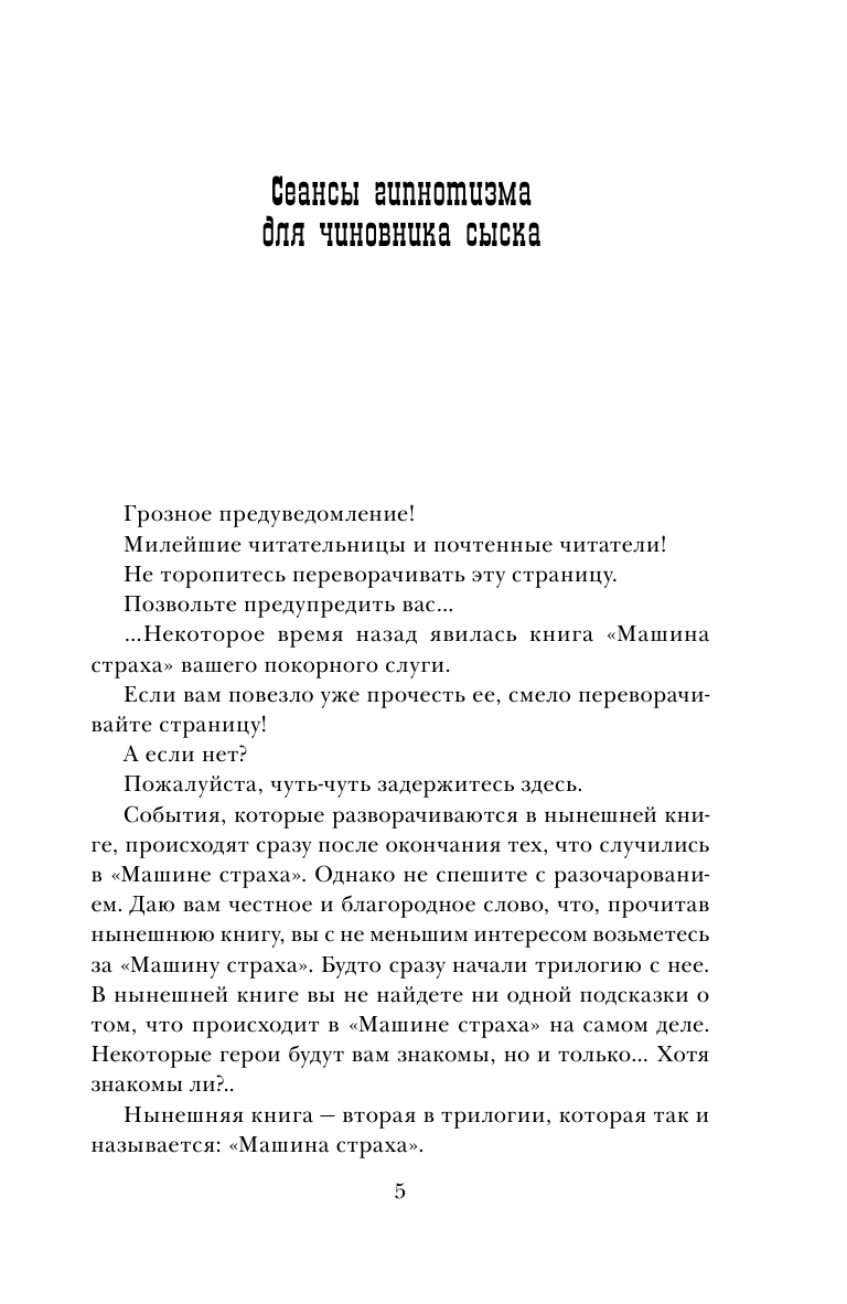 Октябрь 1898 года. Петербург сошел с ума: дама жует беличью шапочку, господин кукарекает, запрыгнув на прилавок, охранник тюрьмы застрелил арестантку. Особую тревогу взывает самоубийство чиновника Охранного отделения: он утонул в центре города. Ванзарову поручают секретное расследование: не только поймать убийцу, но найти исчезнувшую Machina Terroris – Машину страха. Загадочное изобретение, возможно, управляет поступками, превращая людей в безвольных сомнамбул. Чтобы раскрыть тайну, Ванзаров должен заглянуть в самые черные глубины гипноза...