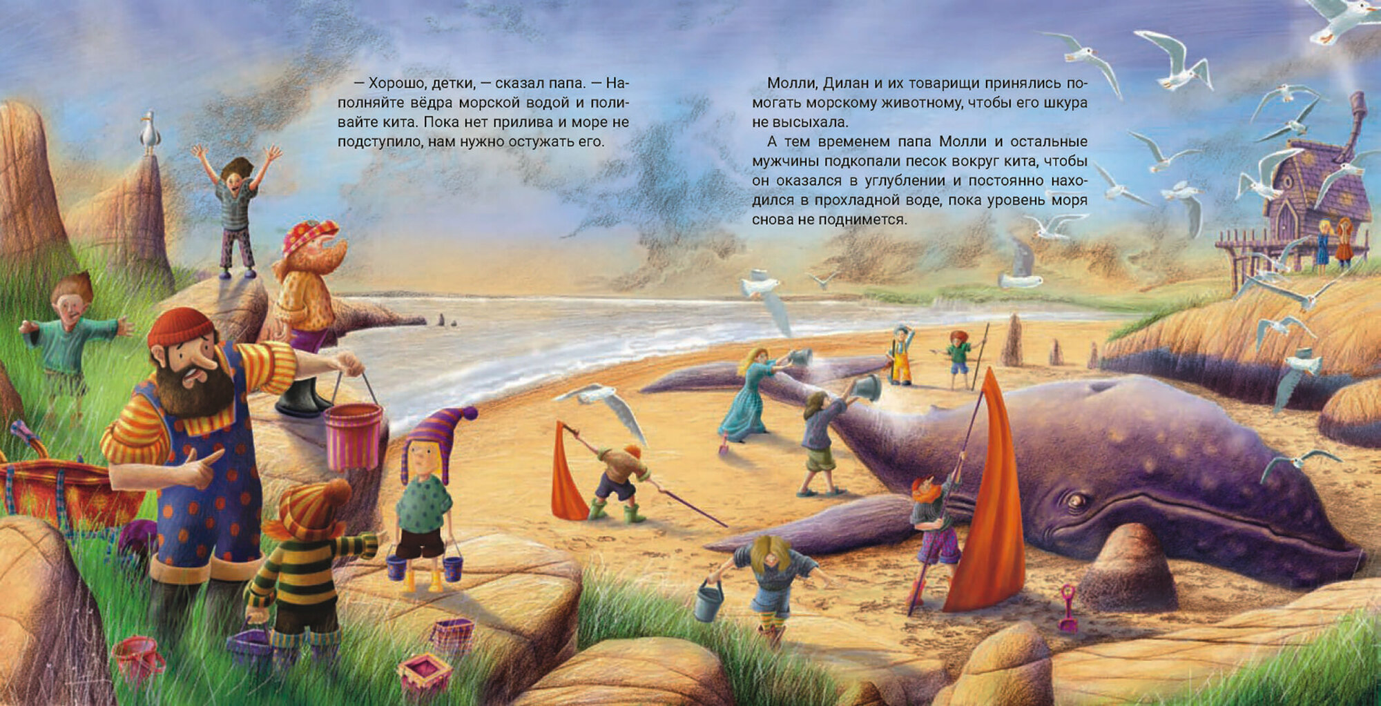 Очень душевная история про спасение кита! Девочка Молли , ее друзья, папа и жители городка, все стараются как могут, все хотят помочь киту вернуться обратно в свою стихию, в море… Иллюстрации красивые, карандашные, теплые и яркие одновременно. Очень добрая и такая душевная история!