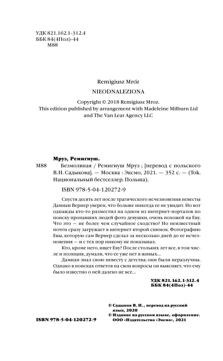 Книга: Безмолвная (Ремигиуш Мруз); Эксмо, Inspiria, Редакция 1, 2021