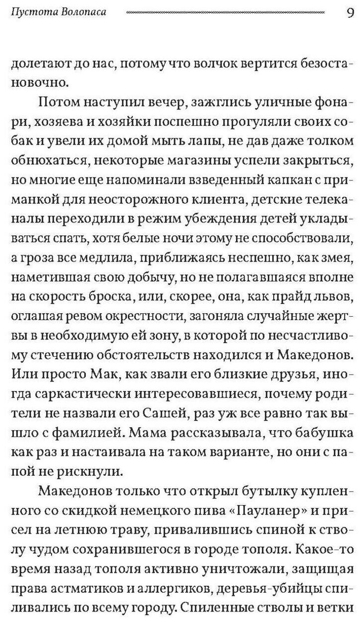 Глубокий и лиричный роман о том, как легко и внезапно может разойтись тонкая ткань повседневной реальсти, и через неё начинает сочиться звездный свет. Было легко соотнести себя с главным героями и их поисками себя, друг друга и вечного смысла. Роман-загадка, роман-пазл, ключ к которому нужно подобрать самому.
