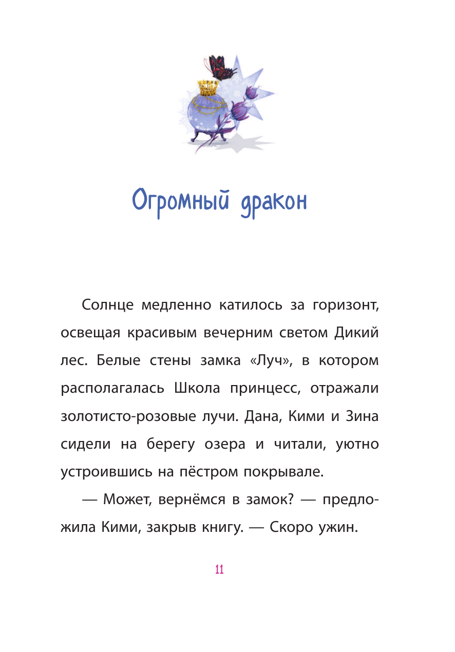 Купила дочке одну книгу из этой серии и её затянуло. Сначала посмотрела картинки, а они там практически на каждой странице, цветные, очень милые. На некоторых страницах рисунки на всю страницу. А потом начала читать. И так ей понравились принцессы-школьницы, что теперь у нас вся серия этих книг (всего их шесть). Эта пока последняя, про девочку Зину (кстати, в предыдущих книгах о ней не упоминается). У каждой принцессы есть своя магия и любимый питомец. В конце каждой книжки детский тест. Однозначно рекомендую.