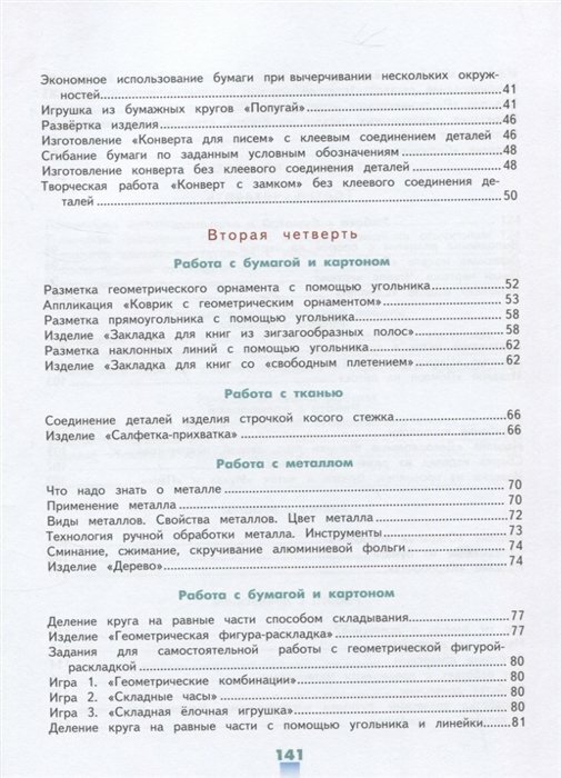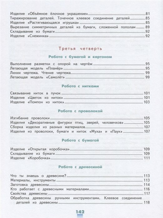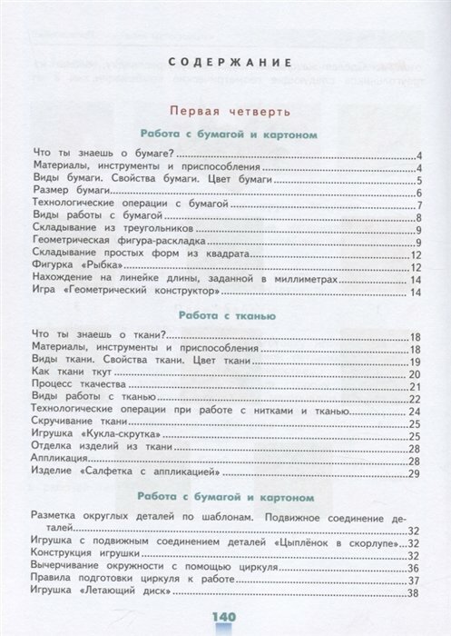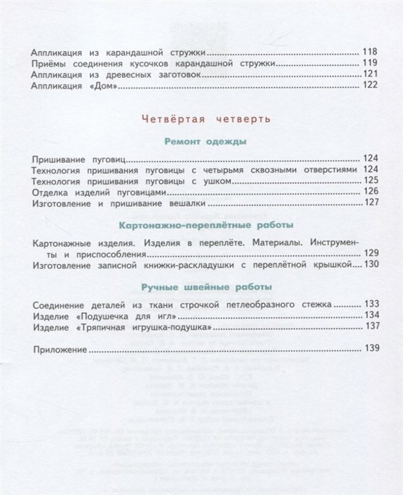 В учебнике представлены образцы творческих заданий, которые должны быть предложены обучающимся в виде раздаточного материала, заготовленного учителем самостоятельно или на основе материалов, размещённых в электронной форме учебника. В учебно-методический комплект для 4 класса входит рабочая тетрадь, в которой представлены графические материалы для подготовки детей к выполнению практических заданий и для формирования и закрепления общетрудовых умений и навыков.