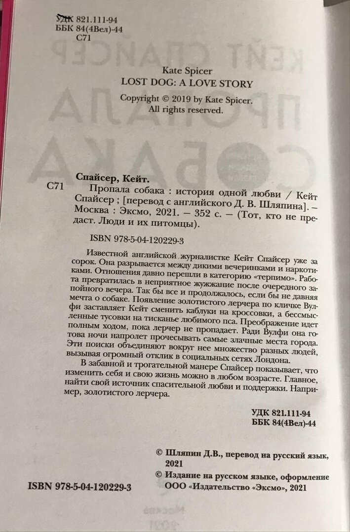 На сегодняшний день товар «Книга: Пропала собака. История одной любви (Кейт Спайсер); Эксмо, Редакция 1, 2021» можно купить с кешбеком в 5 магазинах: Читай-город, book24, ЛитРес, Яндекс.Маркет, Буквоед