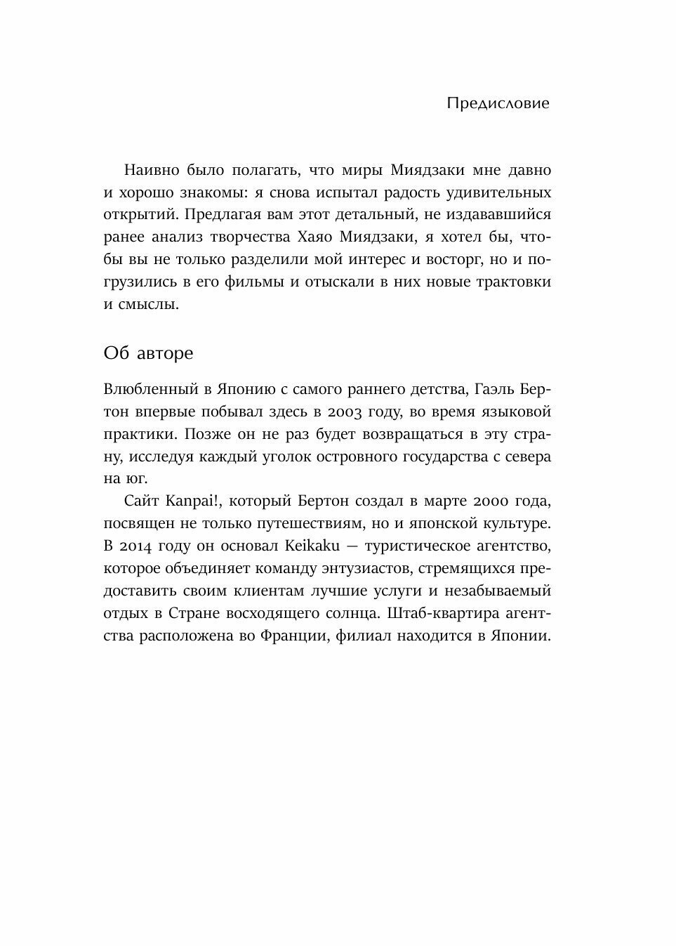 Японская культура принципиально отличается от христианской европейской, к которой мы ближе, поэтому далеко не все в творчестве художника нам понятно. А найти ответы на свои вопросы и глубже погрузиться в волшебные миры хочется, как и узнать о жизни человека, в воображении которого эти миры и населяющие их персонажи родились. Книги в этом помогают, но возникает проблема той же культурной специфики. Написала анализ творчества американка С.Нейпир – получился феминистический фрейдизм, в котором жизнь и работы Миядзаки превратились в иллюстративный материал для ее теорий. Автор этой книги - француз, влюбленный в Японию и ее культуру. Он искренне пытается понять смысл творений режиссера без навязывания своего мнения, оценок не дает. Книга содержит конкретные факты биографий Миядзаки, его сына, соратников, преемников. Я имею представление об этих людях и их фильмах, поэтому все было понятно. Люди, мало знакомые с японской мультипликацией, увидят список имен и названий, который можно принять как руководство к действию. Работы героя книги рассмотрены более подробно: история создания, сюжет, краткий анализ. Ничего лишнего. Если подумать, по каждому фильму Миядзаки можно писать отдельные книги, чтобы собрать все сказанное, увиденное, придуманное и надуманное. Но это будут другие книги.