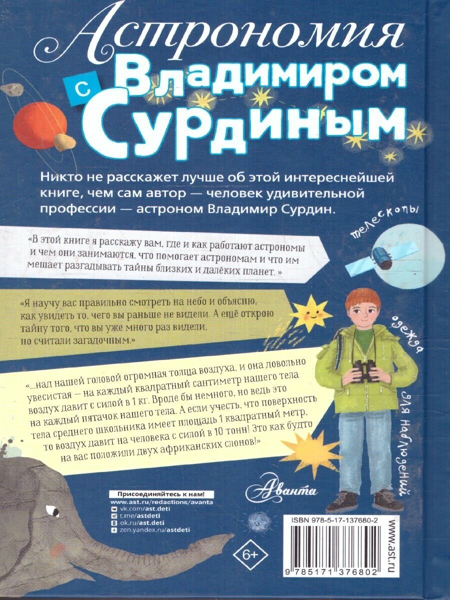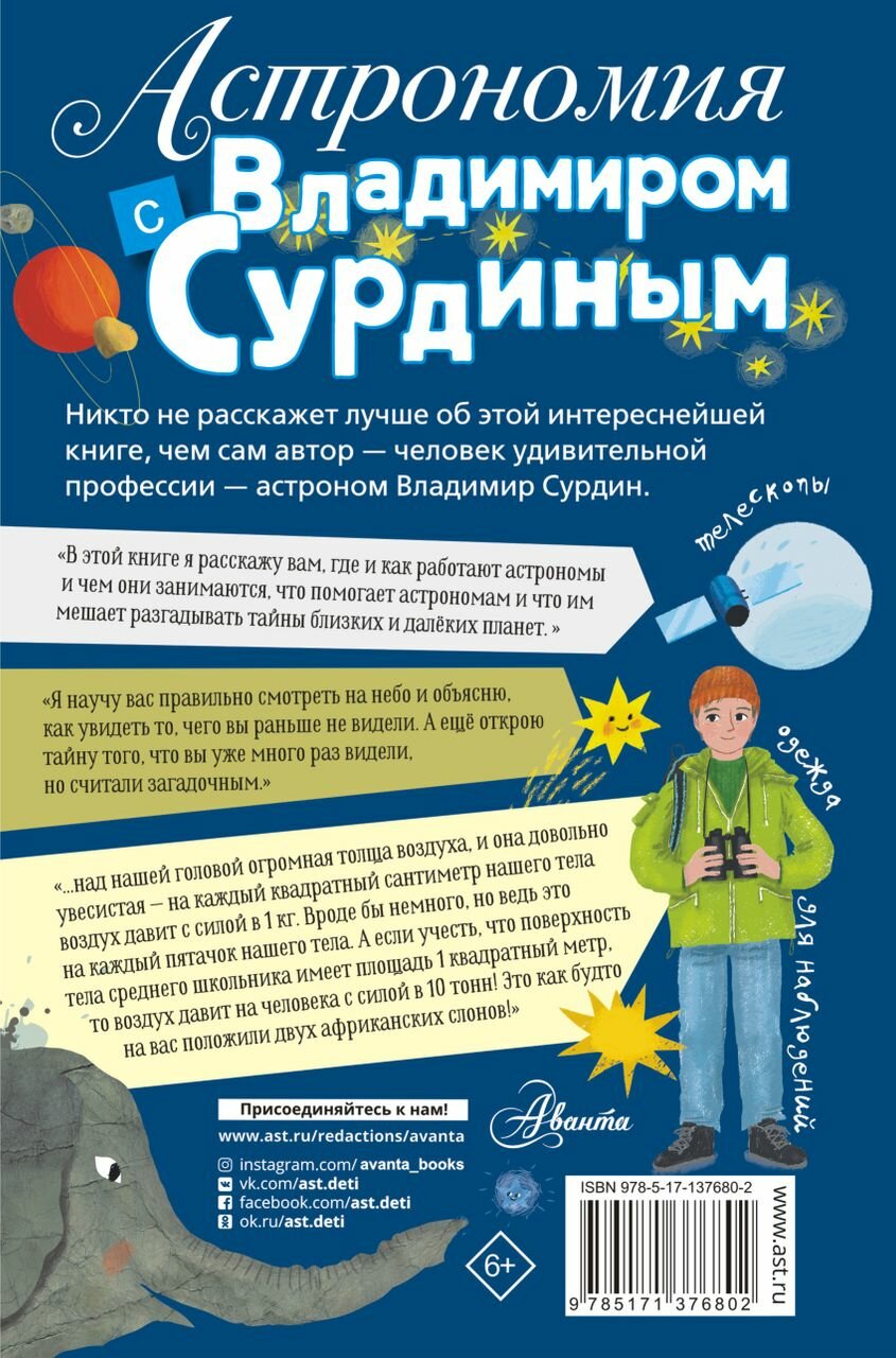 В своей книге «Астрономия с Владимиром Сурдиным» автор расскажет не только о планетах и звездах, но и об истории их изучения, устройстве телескопа и способе смастерить его прототип, принципе работы зрения у людей, животных и роботов, и много других удивительных фактов.