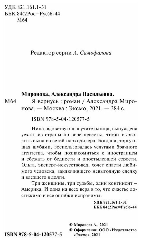 Сервис сравнения цен СкидкаГИД предлагает сравнить цены на товар «Книга: Я вернусь (Александра Васильевна Миронова); Эксмо, 2021»