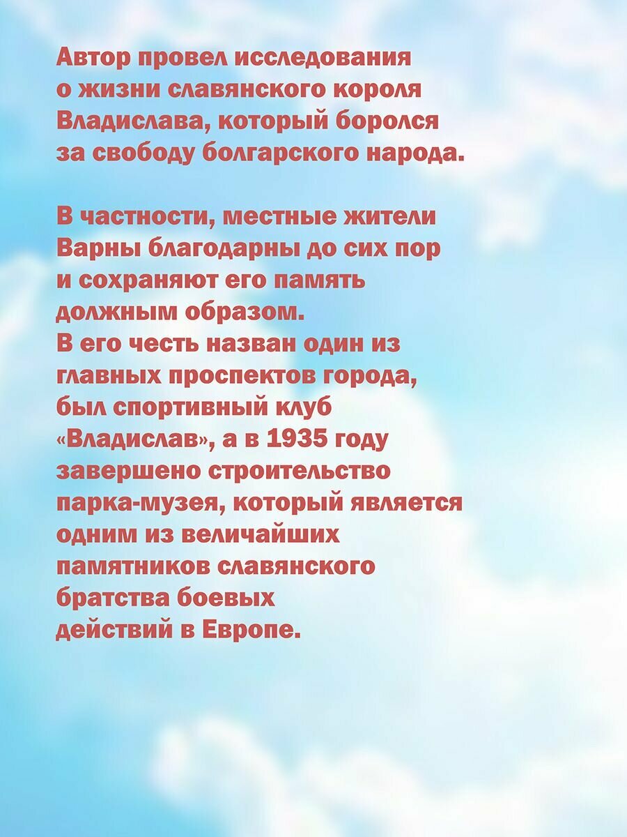 Автор провел исследования о жизни славянского короля Владислава, который боролся за свободу болгарского народа. В частности, местные жители Варны благодарны до сих пор и сохраняют его память должным образом. В его честь назван один из главных проспектов города, был спортивный клуб «Владислав», а в 1935 году завершено строительство парка-музея, который является одним из величайших памятников славянского братства боевых действий в Европе.