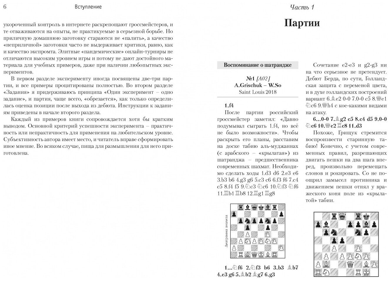 Исследование новых и возрождение старых дебютных редкостей актуально в связи с бурным развитием теории. Освоение длинных вариантов требует недюжинной памяти и более подходит шахматным профессионалам. На примерах креативного творчества гроссмейстеров читателю предлагается оценить качество дебютного эксперимента и решить – уместно ли взять на вооружение идею титулованного игрока.