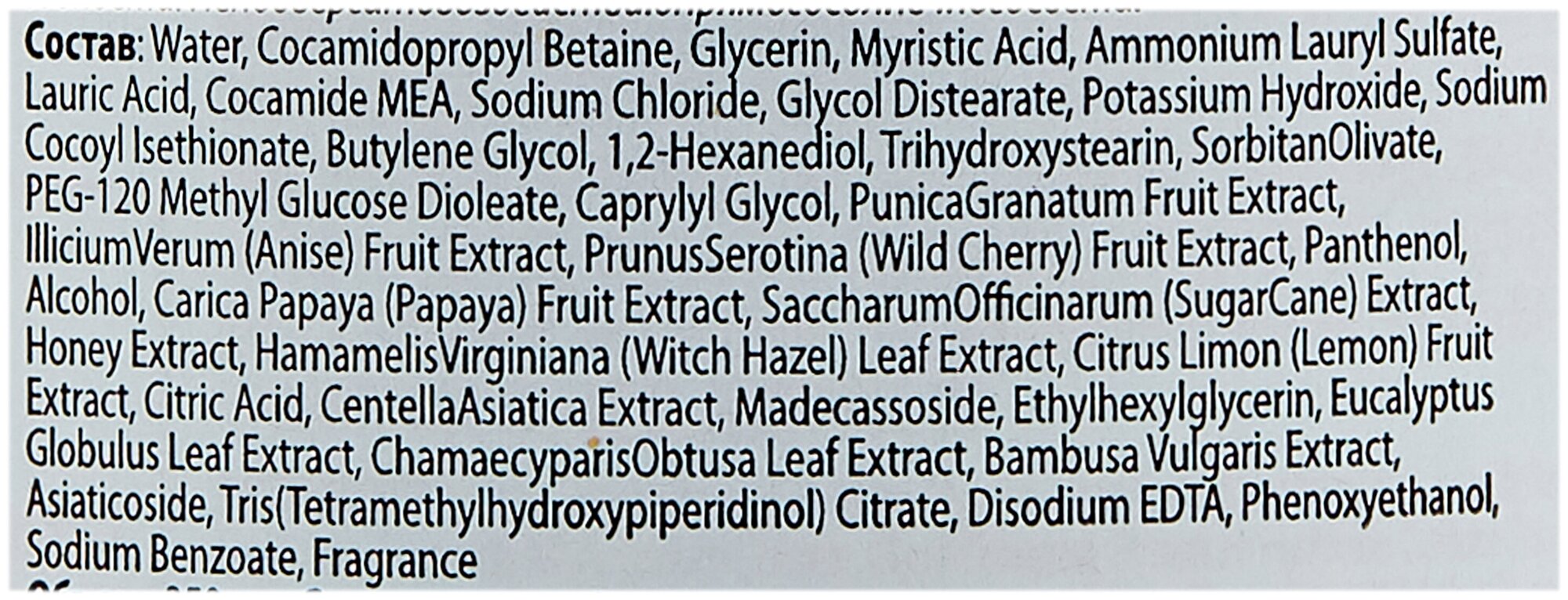 Состав (без парабенов): water, cocamidopropyl betaine, glycerin, myristic acid, ammonium lauryl sulfate, lauric acid, cocamide mea, sodium chloride, glycol distearate, potassium hydroxide, sodium cocoyl isethionate, butylene glycol, 1,2-hexanediol, trihydroxystearin, sorbitanolivate, peg-120 methyl glucose dioleate, caprylyl glycol, punicagranatum fruit extract, illiciumverum (anise) fruit extract, prunusserotina (wild cherry) fruit extract, panthenol, alcohol, carica papaya (papaya) fruit extract, saccharumofficinarum (sugarcane) extract, honey extract, hamamelisvirginiana (witch hazel) leaf extract, citrus limon (lemon) fruit extract, citric acid, centellaasiatica extract, madecassoside, ethylhexylglycerin, eucalyptus globulus leaf extract, chamaecyparisobtusa leaf extract, bambusa vulgaris extract, asiaticoside, tris(tetramethylhydroxypiperidinol) citrate, disodium edta, phenoxyethanol, sodium benzoate, fragrance.