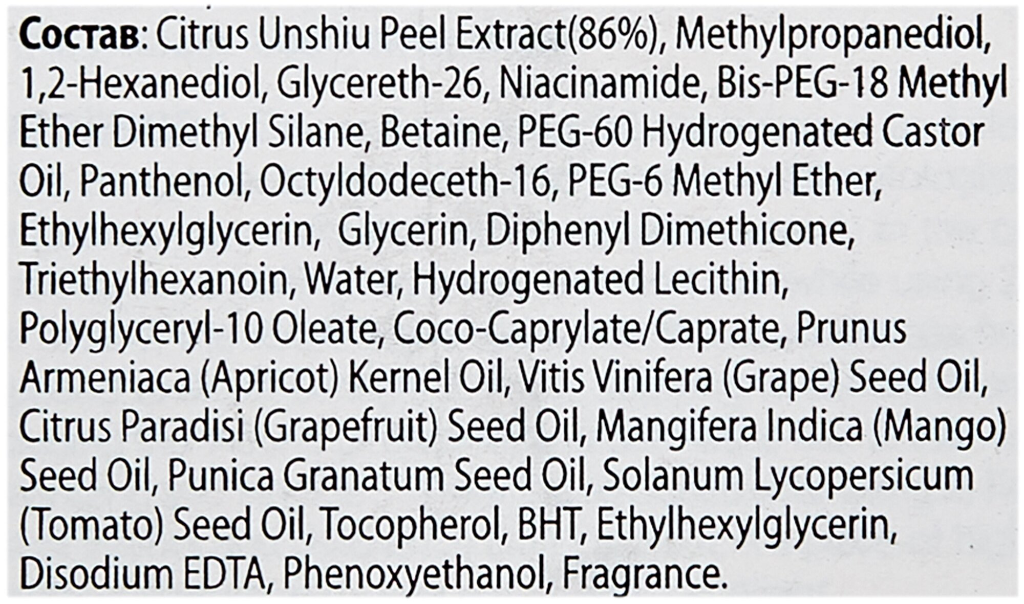 | Состав | Citrus Unshiu Peel Extract (86%), Methylpropanediol, 1,2-Hexanediol, Glycereth-26, Niacinamide, BIS-PEG-18 Methyl Ether Dimethyl Silane, Betaine, PEG-60 Hydrogenated Castor Oil, Panthenol, Octyldodeceth-16, PEG-6 Methyl Ether, Ethylhexylglycerin, Glycerin, Diphenyl Dimethicone, Triethylhexanoin, Water, Hydrogenated Lecithin, Polyglyceryl-10 Oleate, Coco-Caprylate/Caprate, Apricot Kernel Oil, Grape Seed Oil, Grapefruit Seed Oil, Mango Seed Oil, Punica Granatum Seed Oil, Tomato Seed Oil, Tocopherol, BHT, Ethylhexylglycerin, Disodium EDTA, Phenoxyethanol, Fragrance |
