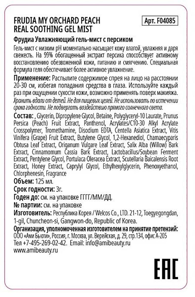 Гель-мист увлажняющий с персиком Frudia/Фрудия 125 мл WelcosCo., LTD. KR (1439088)