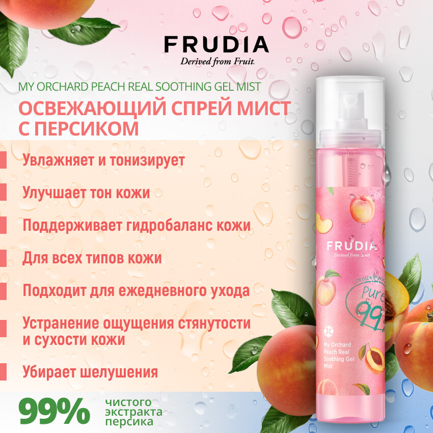 В основе Frudia до 88% фруктовых экстрактов вместо воды, они мягко и нежно заботятся о коже, насыщая ее всеми необходимыми витаминами. Гель-мист с низким pH моментально насыщает кожу влагой, увлажняя и даря свежесть. На 99% обогащенный экстракт персика способствует активному восстановлению обезвоженной кожи, питанию и смягчению. Специальная формула геля обеспечивает более активное увлажнение.