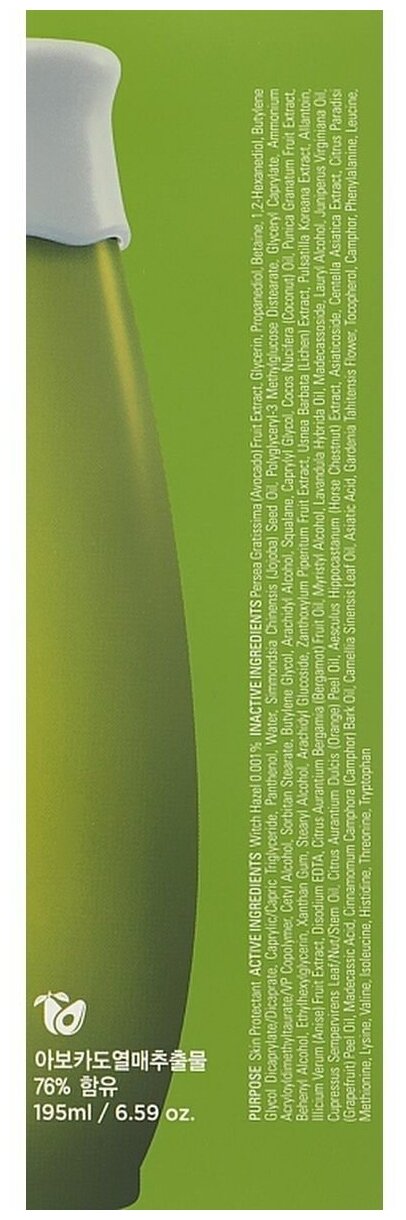 | Состав | Avocado Fruit Extract (62%), Butylene Glycol, Glycerin, Caprylic/Capric Triglyceride, Squalane, Polyglyceryl-3 Methylglucose Distearate, Betaine, 1,2-Hexanediol, Cetyl Alcohol, TRehalose, Panthenol, Glyceryl Stearate, Shea Butter, Ammonium Acryloyldimethyltaurate/VP Copolymer, Water, Glyceryl stearate Citrate, Stearyl Alcohol, Glyceryl Caprylate, Sodium Acrylate/Sodium Acryloyldimethyl Taurate Copolymer, Polyisobutene, Myristyl Alcohol, Caprylyl Glycol, Coconut Oil, Punica Granatum Fruit Extract, Madecassoside, Ethylhexylglycerin, Zanthoxylum Piperitum Fruit Extract, Lichen Extract, Pulsatilla Koreana Extract, Allantoin, Asiaticoside, Lauryl Alcohol, Madecassic Acid, Anise Fruit Extract, Asiatic Acid, Disodium EDTA, Bergamot Fruit Oil, Sorbitan Oleate, Caprylyl/Capryl Glucoside, Lavandula Hybrida Oil, Juniperus Virginiana Oil, Cupressus Sempervirens Leaf/Nut/Stem Oil, Citrus Aurantium Dulcis |