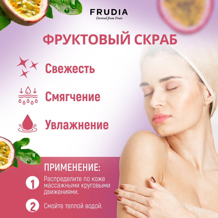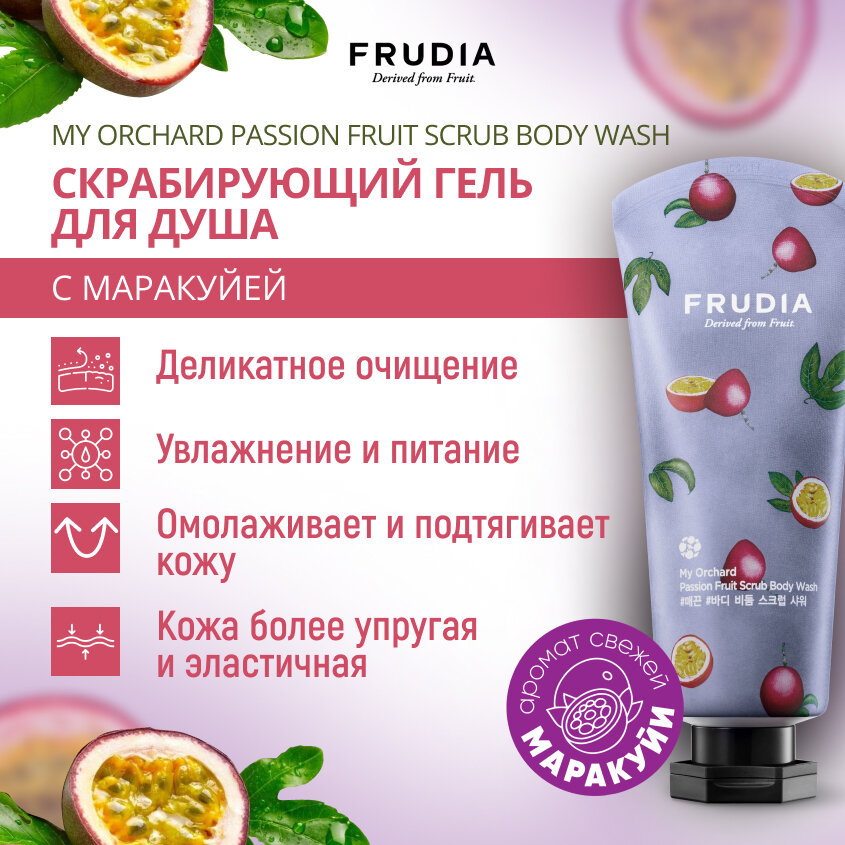 В основе Frudia до 88% фруктовых экстрактов вместо воды, они мягко и нежно заботятся о коже, насыщая ее всеми необходимыми витаминами. Освежающий гель для душа со скрабирующими микрочастицами способствует глубокому очищению кожи. Фруктовые экстракты, богатые витаминами и аминокислотами дарят коже молодость и упругость. Обладает выразительным экзотическим ароматом маракуйи.