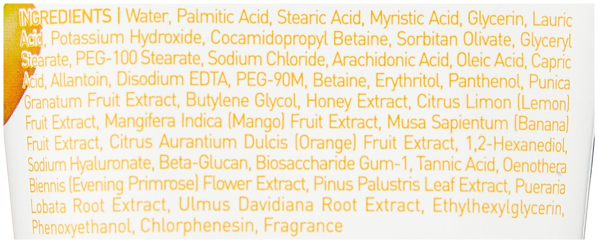 | Состав | water, palmitic acid, stearic acid, myristic acid, glycerin, lauric acid, potassium hydroxide, cocamidopropyl betaine, sorbitan olivate, glyceryl stearate, peg-100 stearate, sodium chloride, arachidonic acid, oleic acid, capric acid, allantoin, disodium edta, peg-90m, betaine, erythritol, panthenol, punica granatum fruit extract, butylene glycol, honey extract, lemon fruit extract, mango fruit extract, banana fruit extract, orange fruit extract, 1,2-hexanediol, sodium hyaluronate, beta-glucan, biosaccharide gum-1, tannic acid, evening primrose flower extract, pinus palustris leaf extract, pueraria lobata root extract, ulmus davidiana root extract, ethylhexylglycerin, phenoxyethanol, chlorphenesin, fragrance |