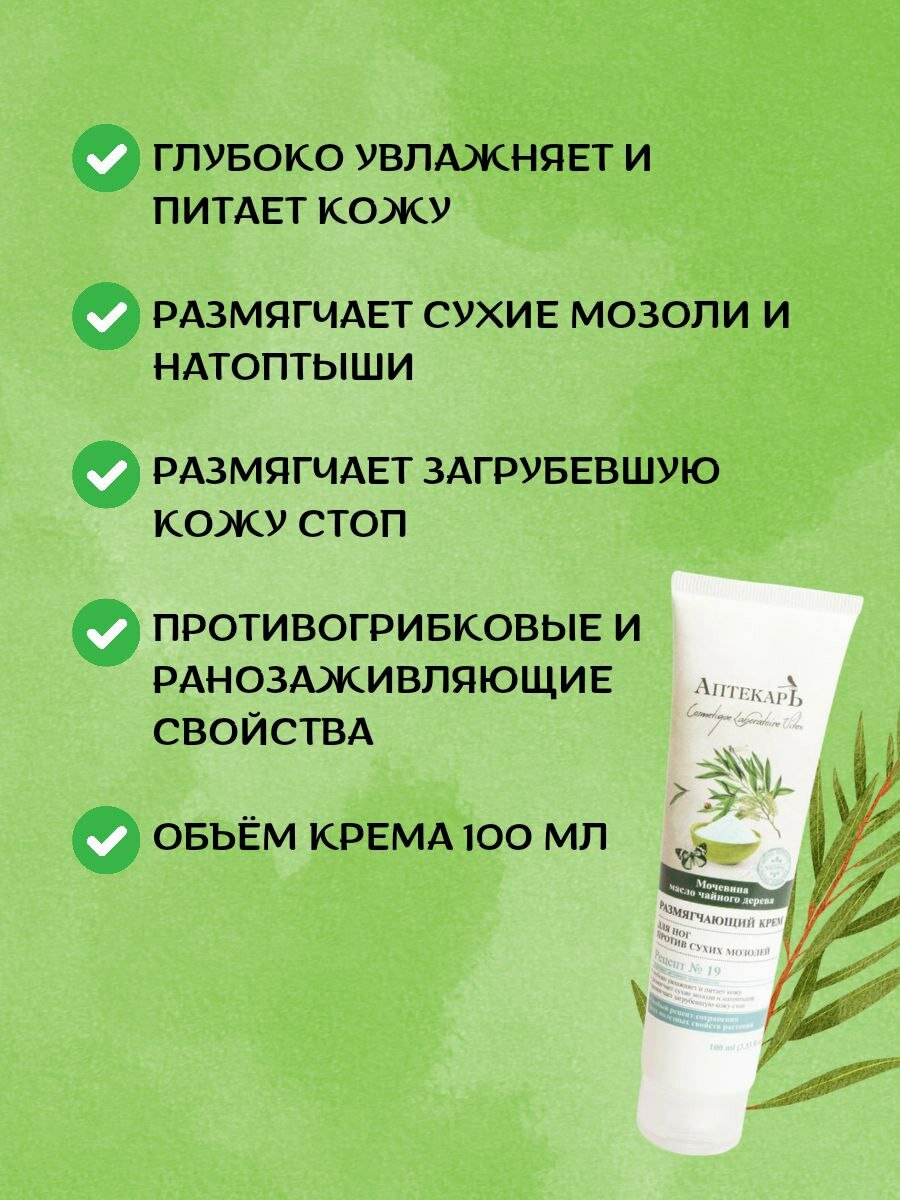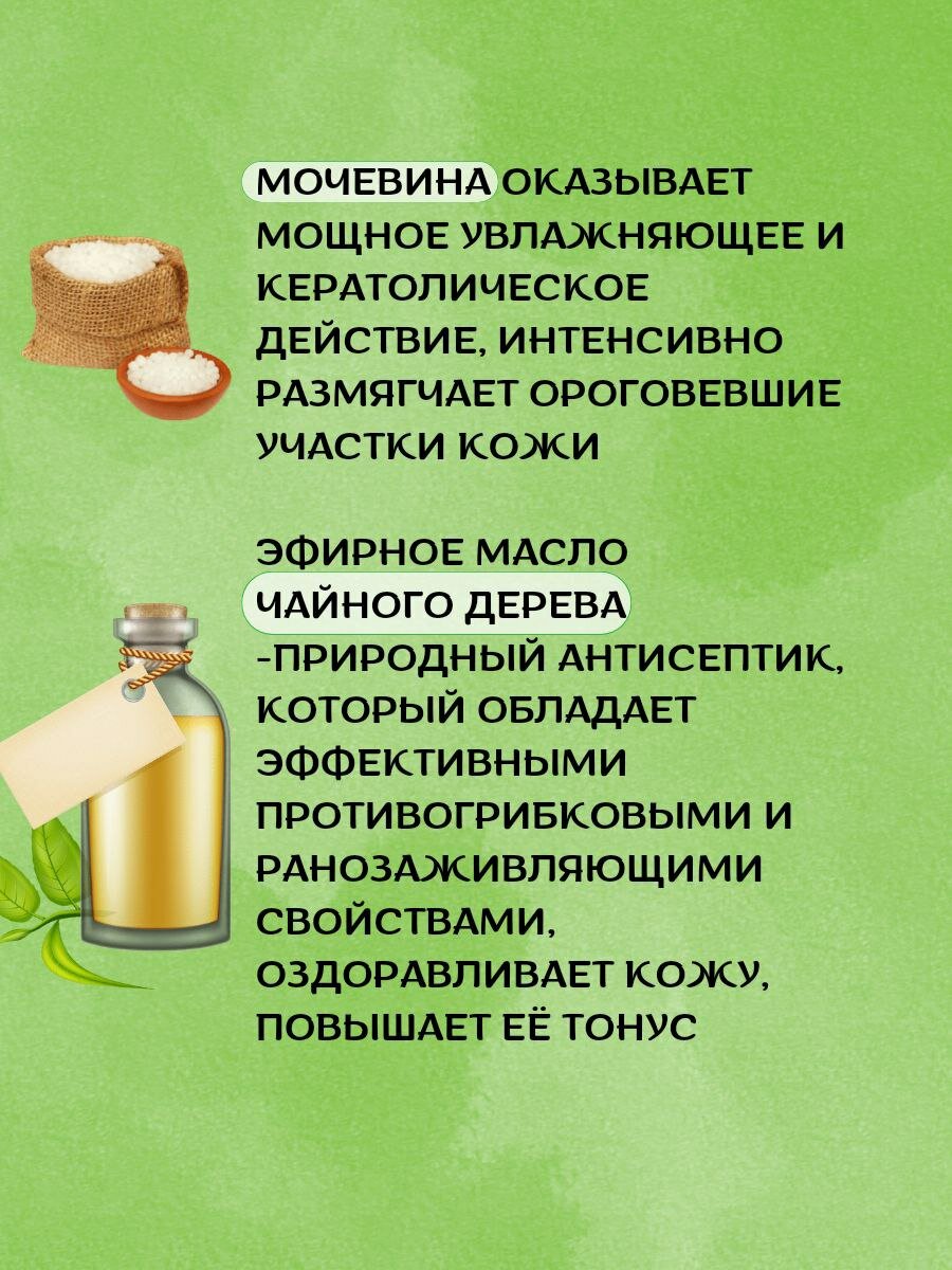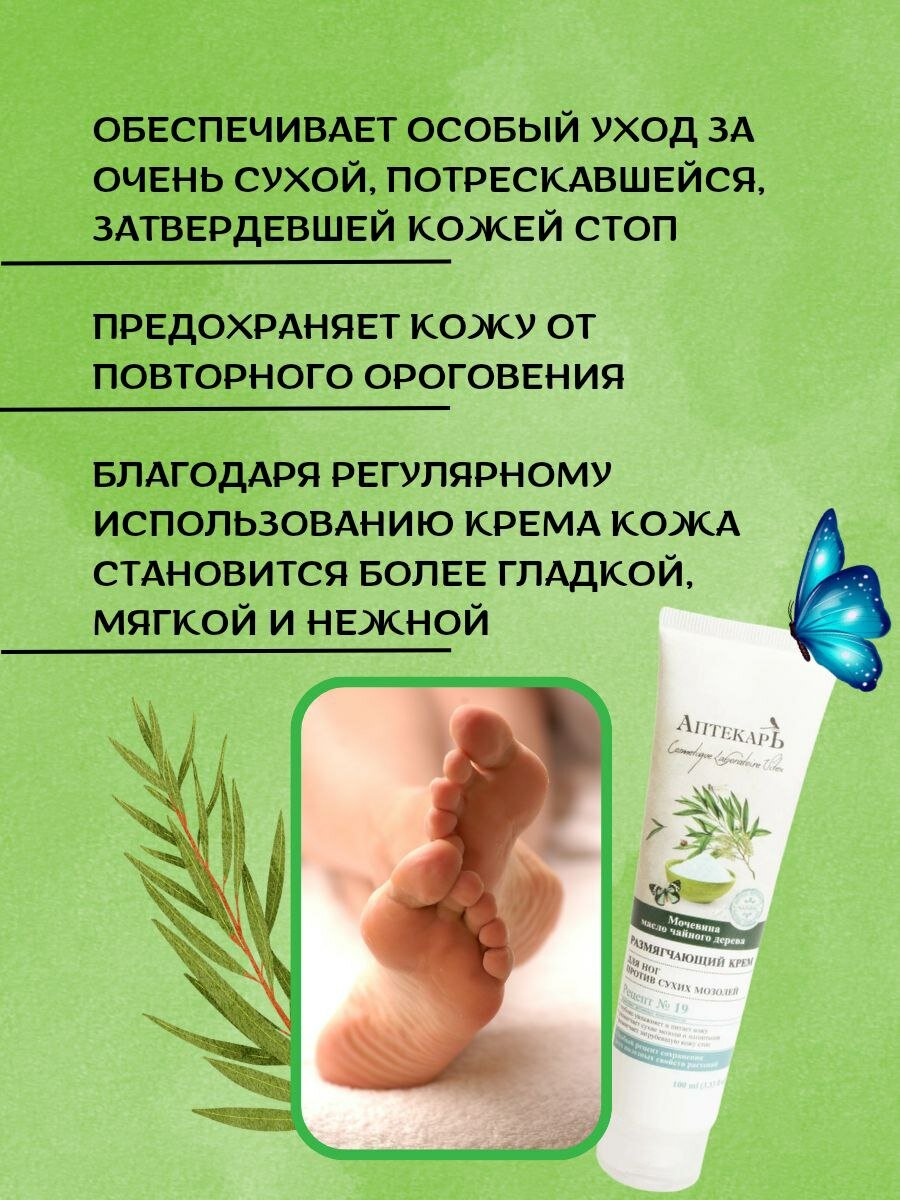 Глубоко увлажняет и питает кожу, размягчает сухие мозоли и натоптыши, размягчает загрубевшую кожу стоп. Специальный крем против сухих мозолей обеспечивает особый уход за очень сухой, потрескавшейся, затвердевшей кожей стоп. Помогает размягчить загрубевшую кожу ступней, сухие мозоли и натоптыши, интенсивно увлажняет, предохраняет кожу от повторного ороговения. Благодаря регулярному использованию крема кожа становится более гладкой, мягкой и нежной. Мочевина (Urea) (15%) оказывает мощное увлажняющее и кератолитическое действие, интенсивно размягчает ороговевшие участки кожи. Эфирное масло чайного дерева (Melaleuca Alternifolia) — природный антисептик, который обладает эффективными противогрибковыми и ранозаживляющими свойствами, оздоравливает кожу, повышает ее тонус. Применение: наносите крем массажными движениями на огрубевшие участки кожи и мозоли 1 раз в день.