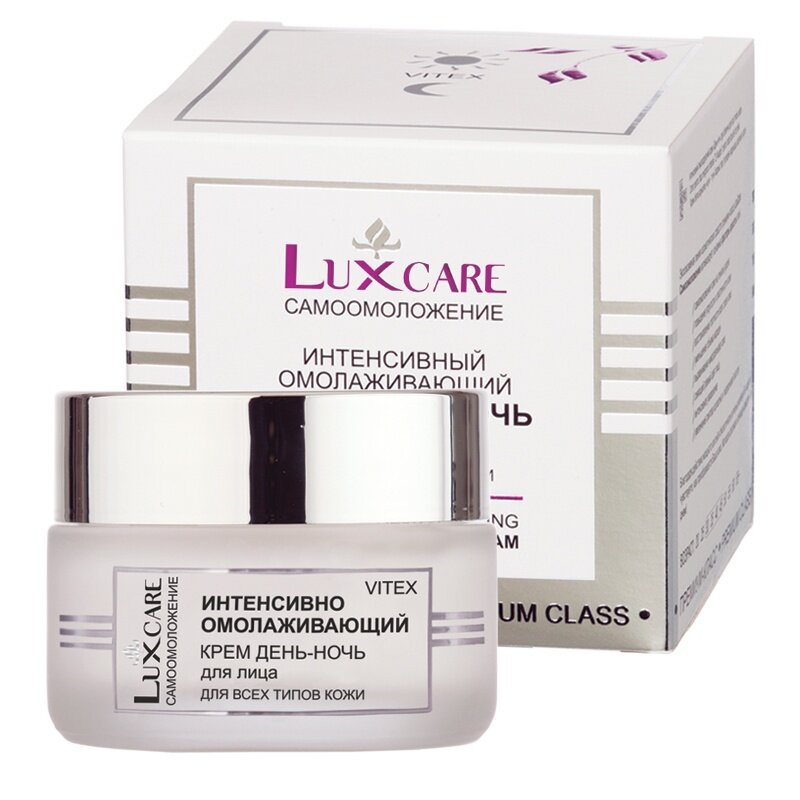 Интенсивный омолаживающий крем день-ночь способствует омоложению клеток кожи, улучшает ее рельеф, придает гладкость и упругость. Активные компоненты крема проникают в глубокие слои эпидермиса и запускают выработку собственных омолаживающих веществ. Регулярное применение крема обеспечивает коже полноценный уход 24 часа в сутки. Применение: равномерно нанесите крем утром и/или вечером на чистую кожу лица и шеи легкими похлопывающими движениями. Идеально использовать с сывороткой глобального действия "LuxCare". Крем подходит для всех типов кожи.