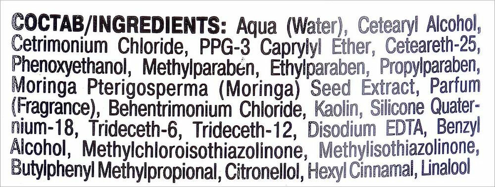 | Состав | вода, цетеариловый спирт, хлорид цетримония, ППГ-3 каприлиловый эфир, цетеарет-25, феноксиэтанол, метилпарабен, этилпарабен, пропилпарабен, экстракт семян Moringa Pterigosperma (моринги), парфюмерная композиция, хлорид бегентримония, каолин, силикон кватерниум-18, тридецет-6, тридецет-12, ЭДТА динатрия, бензиловый спирт, метилхлоризотиазолинон, метилизотиазолинон, бутилфенилметилпропиональ, цитронеллол, гексилциннамаль, линалол |